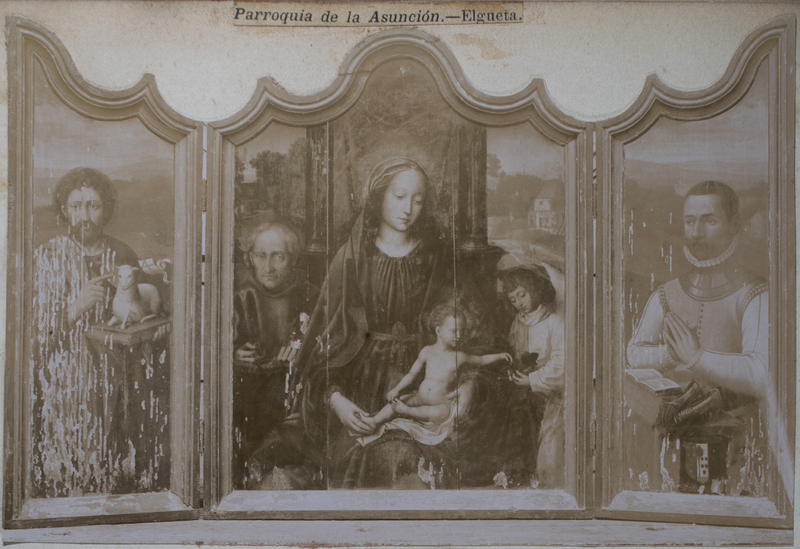 Parroquia de la Asunción.-Elgueta. Tríptico en tabla, estilo flamenco: el cuadro central representa la Virgen con el Niño Jesús en los brazos; los laterales un San Juan y un caballero en cuyo escudo se lee Otegui-Salcedo-Sostoa.
