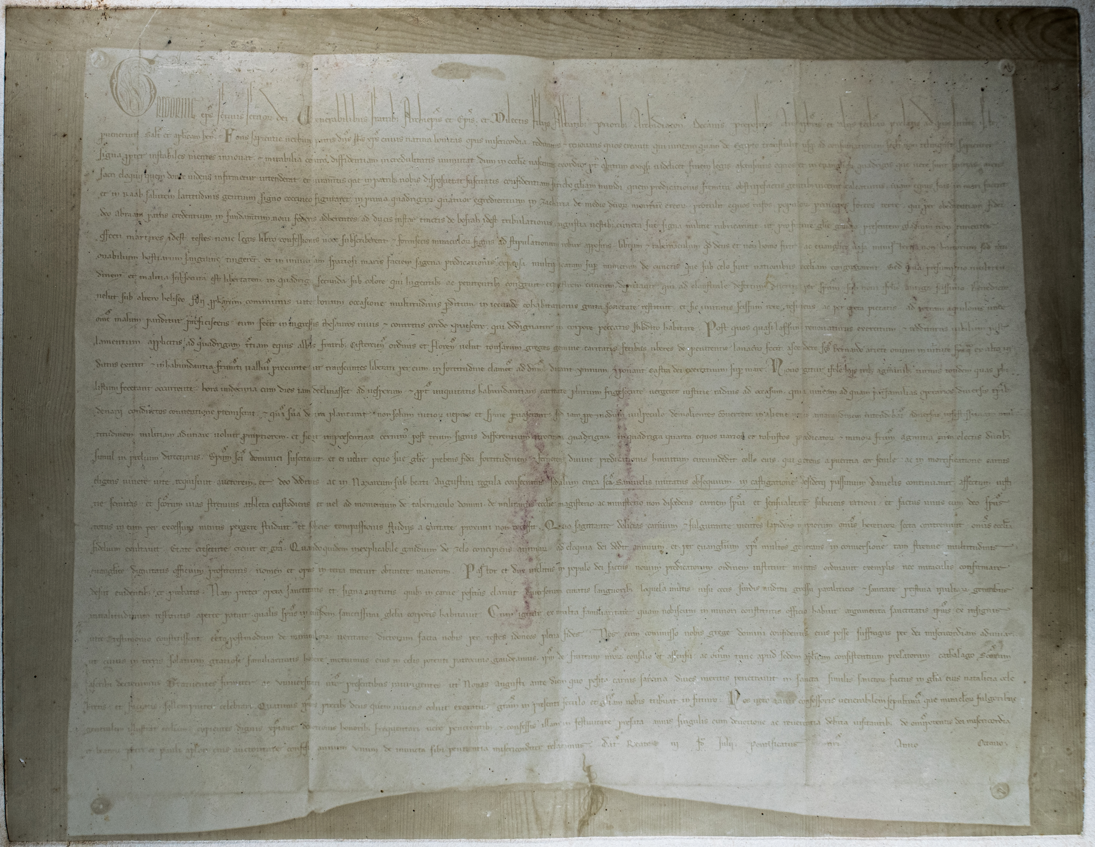 - ES Bula pontificia de canonización de Santo Domingo de Guzmán, escrita en hermosa letra del siglo XIII. Expedida en Rieti, el 3 de julio de 1234. Propiedad del Sr. Añibarro.