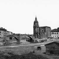 c. 1874 Vista tomada desde el muelle de Ripa mostrando el final de la calle de la Estufa, hoy Vda. de Epalza, y los primeros números de la calle Sendeja, cuyas casas de la izquierda desaparecerán pronto para construirse las casas de Manuel Taramona. En el borde del muelle, las instalaciones militares de la denominada "Bateria de la Muerte", utilizadas en la defensa de la villa durante la II Guerra Carlista.