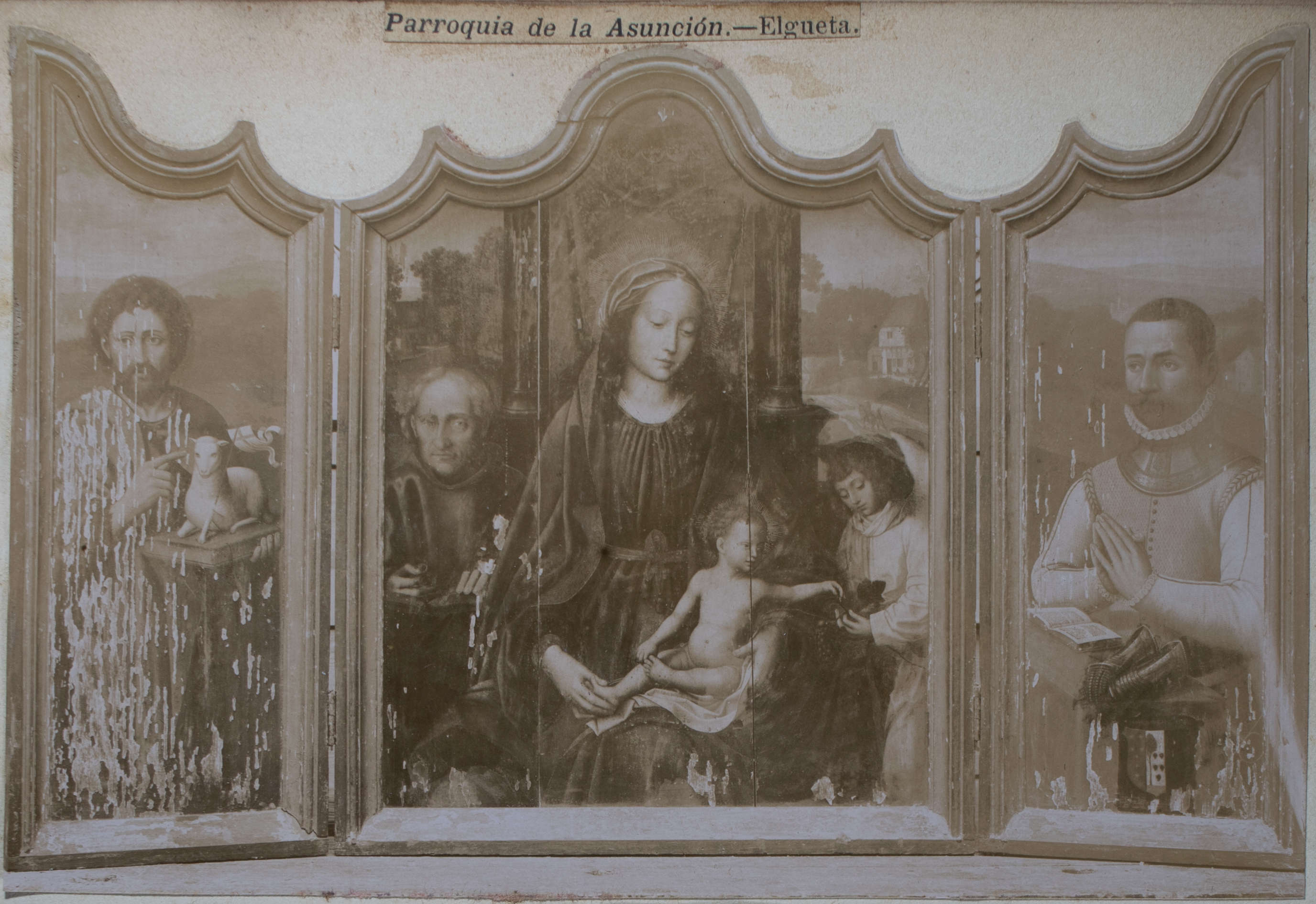Parroquia de la Asunción.-Elgueta. Tríptico en tabla, estilo flamenco: el cuadro central representa la Virgen con el Niño Jesús en los brazos; los laterales un San Juan y un caballero en cuyo escudo se lee Otegui-Salcedo-Sostoa.