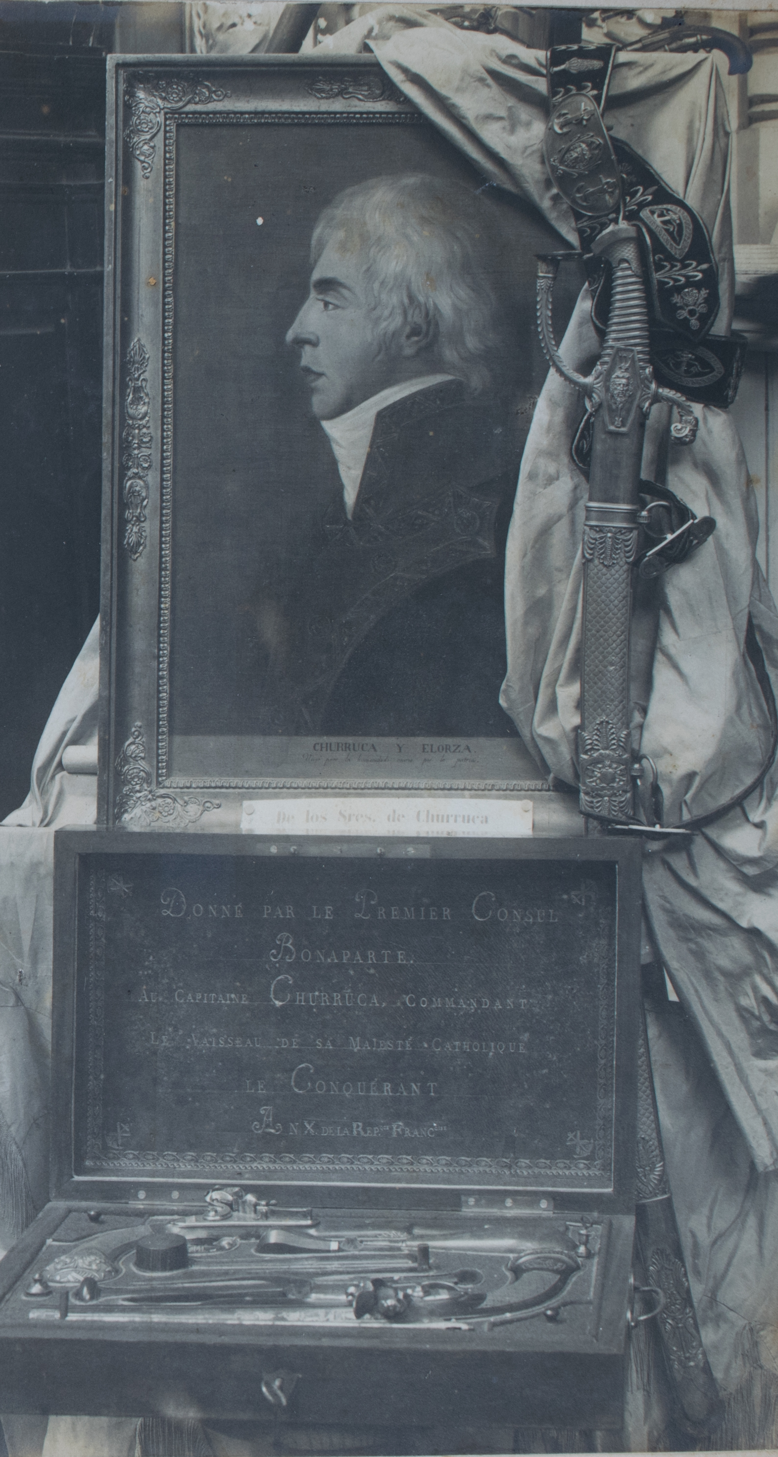 Retrato al óleo del héroe de Trafalgar D. Cosme Damián de Churruca (copia) Espada con puño y vaina de bronce cincelado, y cinturón de terciopelo negro bordado en oro, regalo de Napoleón I. Dos pistolas, en su estuche, regalo del primer Cónsul de la República Francesa Napoleón Bonaparte. De los Señores de Churruca (San Sebastián)