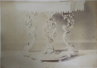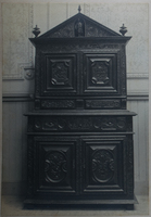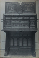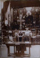 Vista general Mesa de la Excma. Sra. Vda. de O'Reilly, armadura de la Parroquia de Aia, objetos religiosos de la Parroquia de Cestona, Jarrón del Ayuntamiendo de San Sebastián regalado por la Reina de Inglaterra. Al fondo el órgano del Bellas Artes -