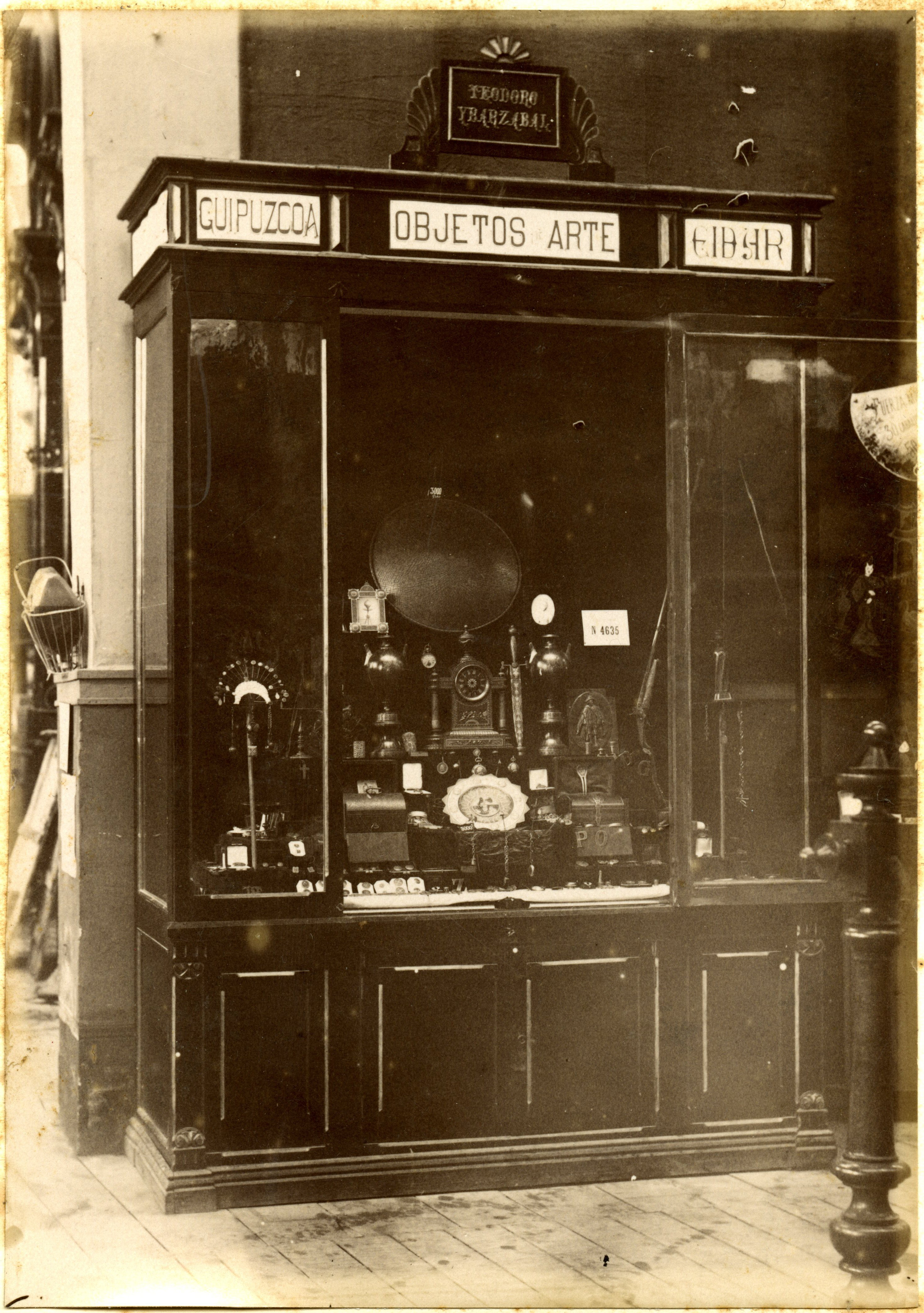 Don Teodoro Ibarzabal, de Eibar, exhibe en elegante vitrina, variados objetos de arte, consistentes en toda clase de trabajos en hierro damasquinado y repujado, sobresaliendo en primer término, un magnífico plato joyero de acero é hierro, con un medallón en el centro que representa á David enseñando la cabeza del gigante Goliat, cuyo cuerpo se ve á los pies del primero. Estas figuras son repujadas, sus trajes enchapados de oro, como también el fondo. Rodea á estas figuras un conjunto artístico de damasquinados en oro, resaltando ocho medallones intercalados, que son repujados y enchapados de plata. Además de esta obra de arte, llaman la atención en esta instalación, una rodela orlada de plata y damasquinada en oro, de estilo morisco; cuatro jarrones de bronce con peanas de hierro; una caja de reloj de sobre mesa de estilo Luis XV; una escribanía de acero damasquinado con oro y plata; un cuadro repujado sobre chapa de hierro, que representa los mendigos; otros dos, representando un gaitero italiano, y el otro una leñadora; dos cofrecitos de hierro, uno de estilo morisco y el otro de estilo griego; sortijas, relojes de bolsillo con medallones, con bustos de Alfonso XII y Leon XIII; una gran variedad de cadenas de reloj, petacas, fosforeras puños de bastón, pulseras, alfileres, etc.; y por último, un cuadrito repujado sobre chapa de plata con el busto qe S. M. la Reina Regente de España. Todos estos objetos, á cual más notables bajo el punto de vista artísticos se hallan colocados tan convenientemente, que llamando la atención su conjunto, atrae para admirar sus detalles.