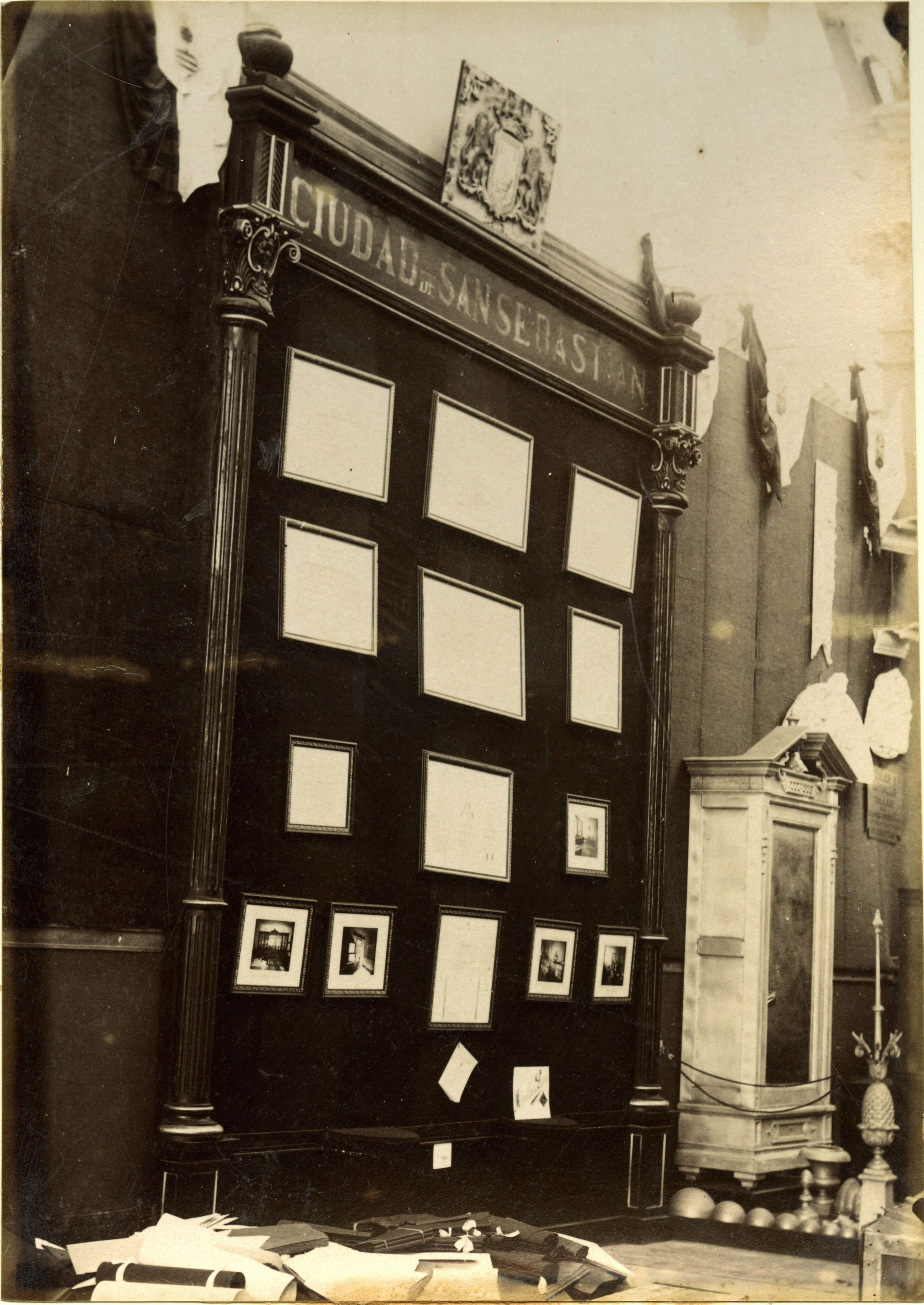En esta sencilla y elegante instalación, de fondo encarnado, limitada por dos columnas con su basamento general y las armas de la ciudad en el centro de su parte superior, representa el Excmo. Ayuntamiento de la ciudad de San Sebastián, en catorce cuadros: 1 Planos de la nueva cárcel del distrito, que actualmente se halla en construcción, en los cuales se manifiesta, además de la elegancia arquitectónica, que dicha obra se sujeta á los adelantos que se han hecho en las edificaciones especiales del objeto de esta, y 2 Fotografías del nuevo Laboratorio Municipal, que este año se ha establecido, en tan buenas condiciones y con tales elementos, que llama la atención de las personas inteligentes que le visitan. Esta instalación, en medio de su sencillez, honra mucho al Excmo. Ayuntamiento de San Sebastián, porque los dos asuntos que exhibe, son gallarda muestra del continuado progreso de la culta capital guipuzcoana.