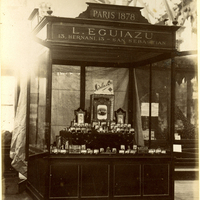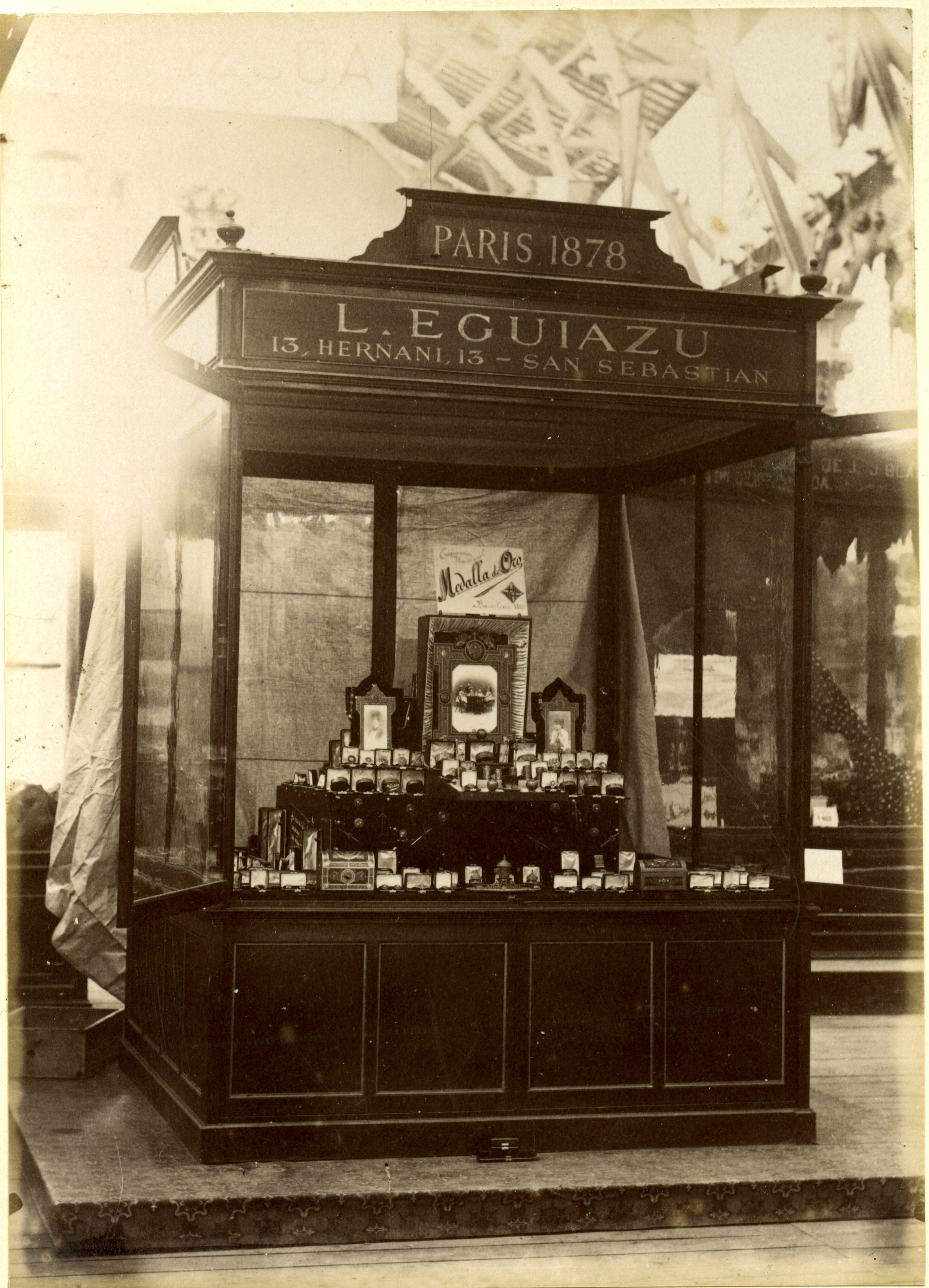 En una elegante vitrina aislada, de cuatro, fachadas, exhibe, el reputado y conocido artista en incrustaciones D. Leon Eguiazu, que además de sus talleres de San Sebastián, tiene también otro establecido en Madrid, una gran variedad de su importante industria. Forma una pirámide escalonada por cada una de las cuatro caras, toda ocupada por numerosos objetos de gran valía; entre las que principalmente llaman la atenci6n, un marco de regulares dimensiones, con varios altos relieves y cincelados; otros dos algo menores, dos joyeros, varias pulseras, y entre estas una de grandes relieves; y por último, un gran surtido de novedades para señoras y caballeros, todos en sus correspondientes estuches.
