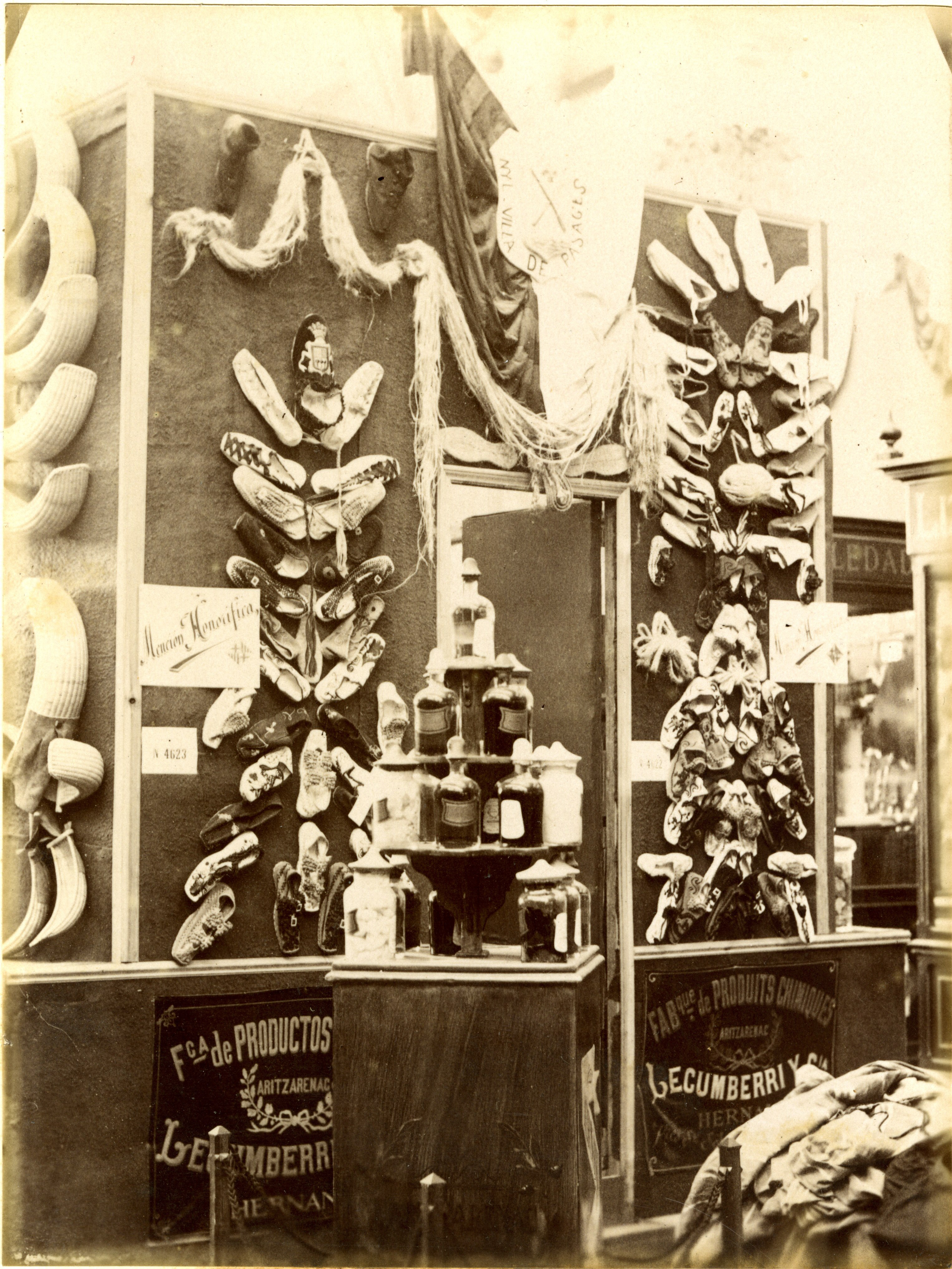 - Instalación núm. 52. Don Juan José Larrañaga, de Vergara; fábricante de alpargatas, expone una colección de diferentes clases y tamaños, adornadas con cintas, y bordadas con colores; así mismo, una de terciopelo verde oscuro, con el escudo de armas de la Provincia, bordado en oro y plata.