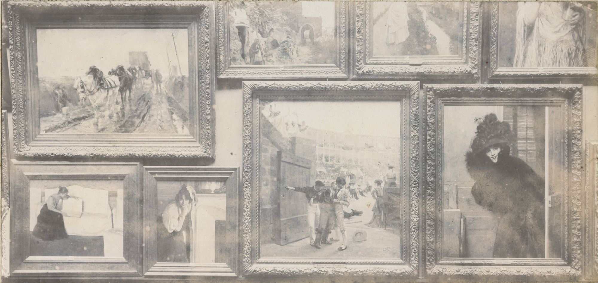 69-"Le Fardier" de D. Ulpiano Checa. 173-"Gitanos" de Orange. 167-"Vendedora" de Melnik". 158-"Consuelo (florista)" de Ricardo Madrazo y Garreta. 201-"Mirando un libros" de Santiago Rusiñol. 202-"Riendo" de Santiago Rusiñol. 237-"¡Bravo toro!" de Mr. Henri Zo. 143-"Peut-on entrer?" de Mr. Gaston Linden.