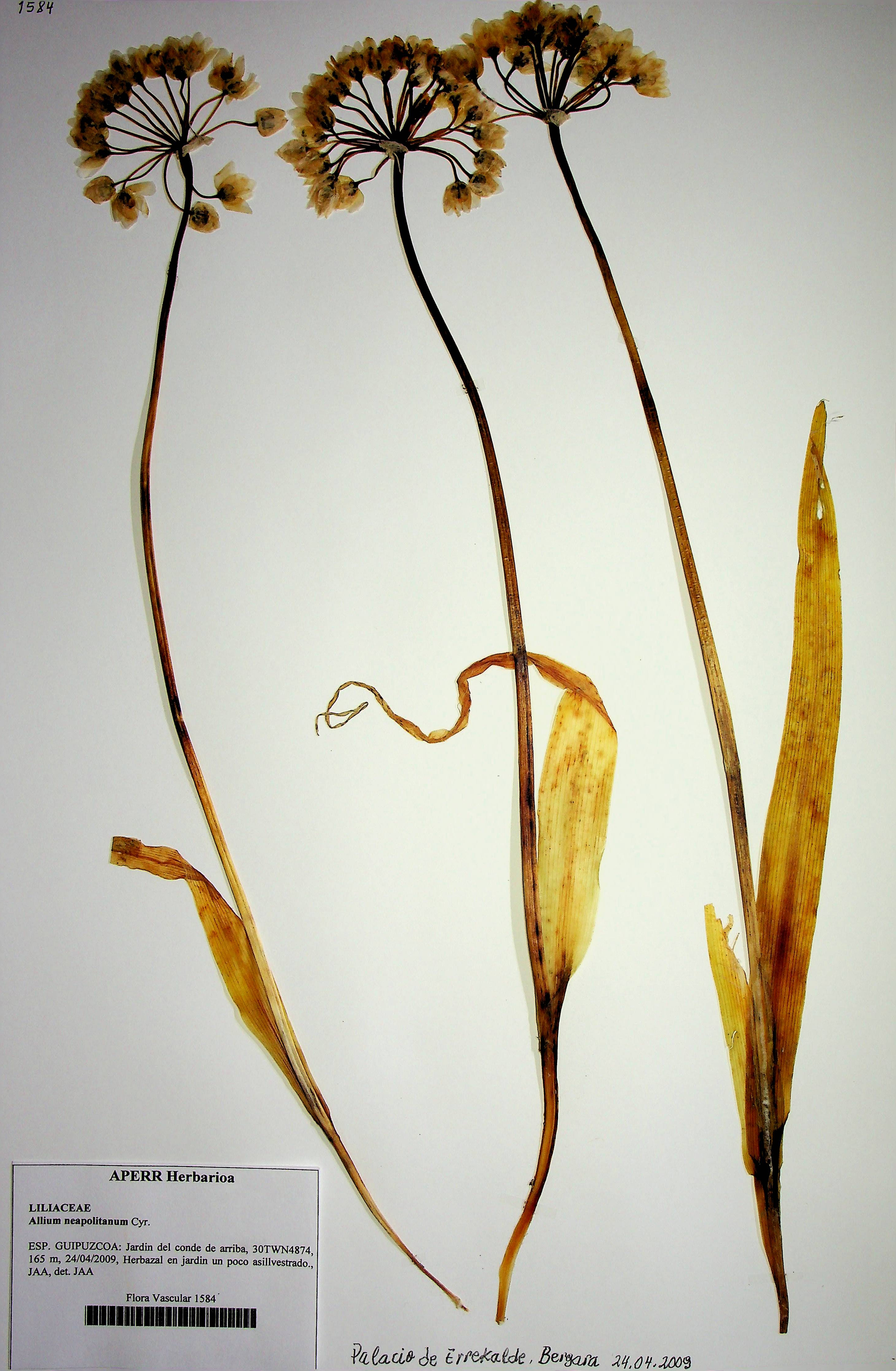Planta de la familia de las liliáceas, en las que se incluyen la flor de lis, la azucena o los jacintos, flores que representan la nobleza y la belleza y sin embargo nuestra planta que pertenece al género Allium le lleva a emparejarse con algo que es escasamente poético como los ajos. No obstante, este ajo ha sido utilizado en jardinería como especie ornamental por la belleza de su floración y eventualmente la encontramos asilvestrada como este ejemplar del herbario que fue recolectada en los ahora cuidados jardines del actual Laboratorium de Errekalde en Bergara, palacio en el que vivió el Conde de Peñaflorida fundador de la Real Sociedad Bascongada del Amigos del País. En estos jardines prolifera por doquier, asilvestrada, desde hace muchos lustros junto a otras especies como verónicas, ranúnculos, murajes, bújulas, cárices, etc. Además de varias especies de gramíneas, que juntas en abril tupen el suelo de un vistoso colorido.