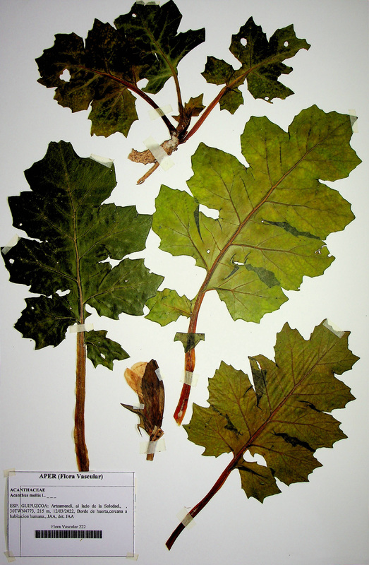 Cuenta la historia que el arquitecto griego Calimaco contemplando el sepulcro de un joven corintio se vio atraído e inspirado por el acanto que lo cubría, tanto que, admirado por la belleza y la armonía del conjunto lo tomó como modelo para crear el capitel corintio. En el lenguaje de las flores, el acanto es el emblema de las bellas artes. Como no podía ser de otra manera el ejemplar del herbario fue recolectado junto a las ruinas de un antiguo convento de monjas de la orden de la Virgen de la Soledad, en Bergara.