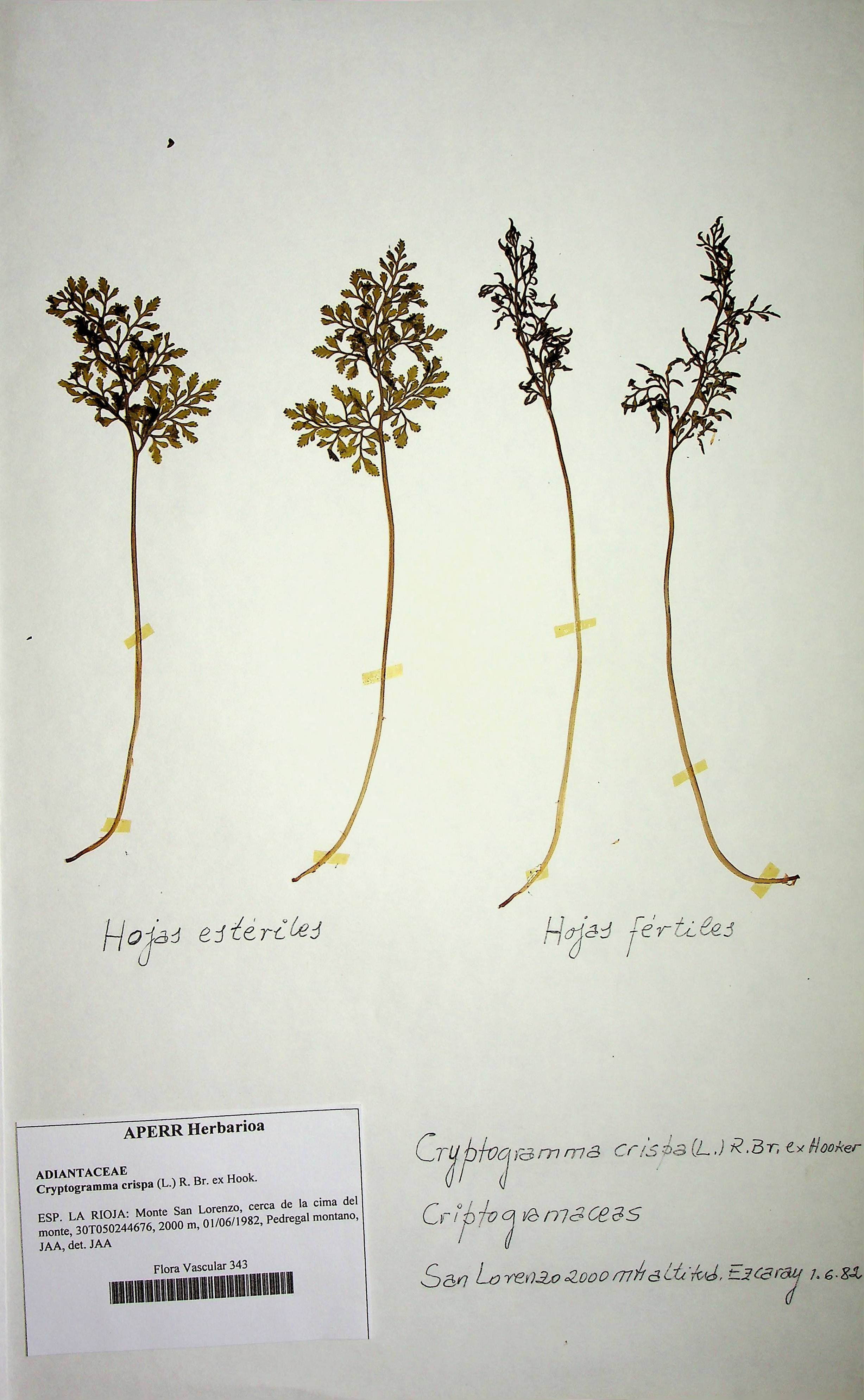 Delicado helecho que apenas alcanza los 30cm. Dispone de frondes (así se denominan las “hojas” de los helechos) estériles y otros fértiles que son los que desarrollan las esporas. Crece en las fisuras de rocas silíceas ácidas en alturas superiores a los 1500m. en las montañas de pronunciada innivación. Muy rara o inexistente en Euskadi, este ejemplar del herbario fue recolectado en el monte San Lorenzo de la Sierra de la Demanda en La Rioja.