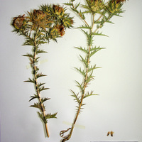 A pesar de que este cardo, de entrada, con sus agudas espinas no invite a acercarnos a ella, las flores de esta compuesta poseen unas brácteas doradas que semejan pétalos, que ofrecen, aun tras marchitarse, un atractivo contraste con el resto de la flor. El ejemplar fue recolectado en una ladera caliza soleada entre Bergara y Antzuola, que ofrece condiciones para que las plantas con apetencias mediterráneas puedan instalarse en él, como es el caso de esta especie que no es nada corriente en la zona.