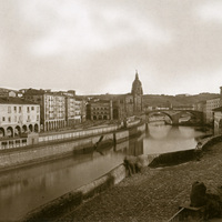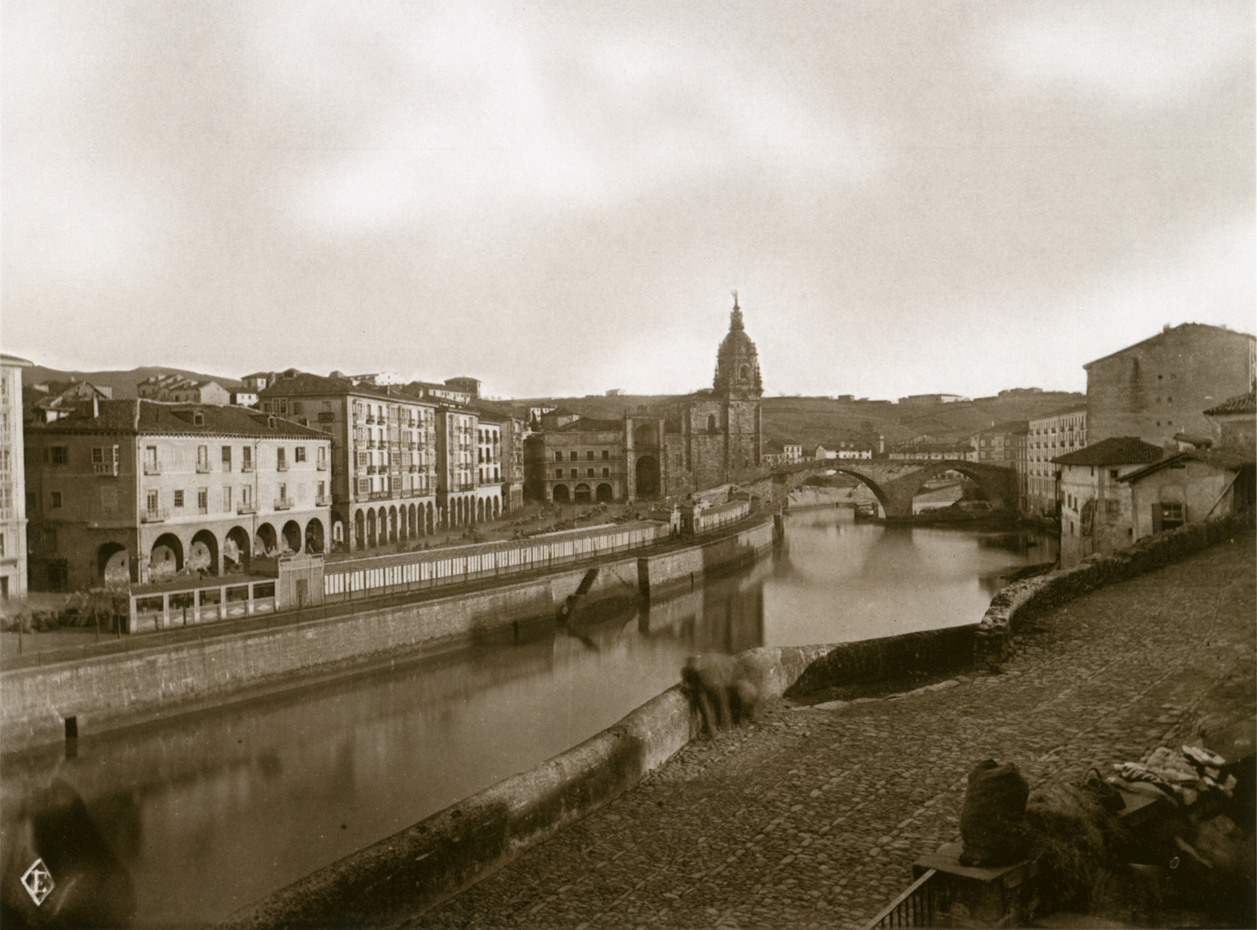 San Antón y la Plaza Vieja desde la calle Marzana hacia 1865. Encauzada la margen derecha, la plaza vieja aumenta de tamaño. En el centro el viejo ayuntamiento, demolido en 1895. En la margen izquierda las casas están directamente sobre la ría, donde hoy se encuentra el muelle de Marzana.