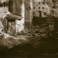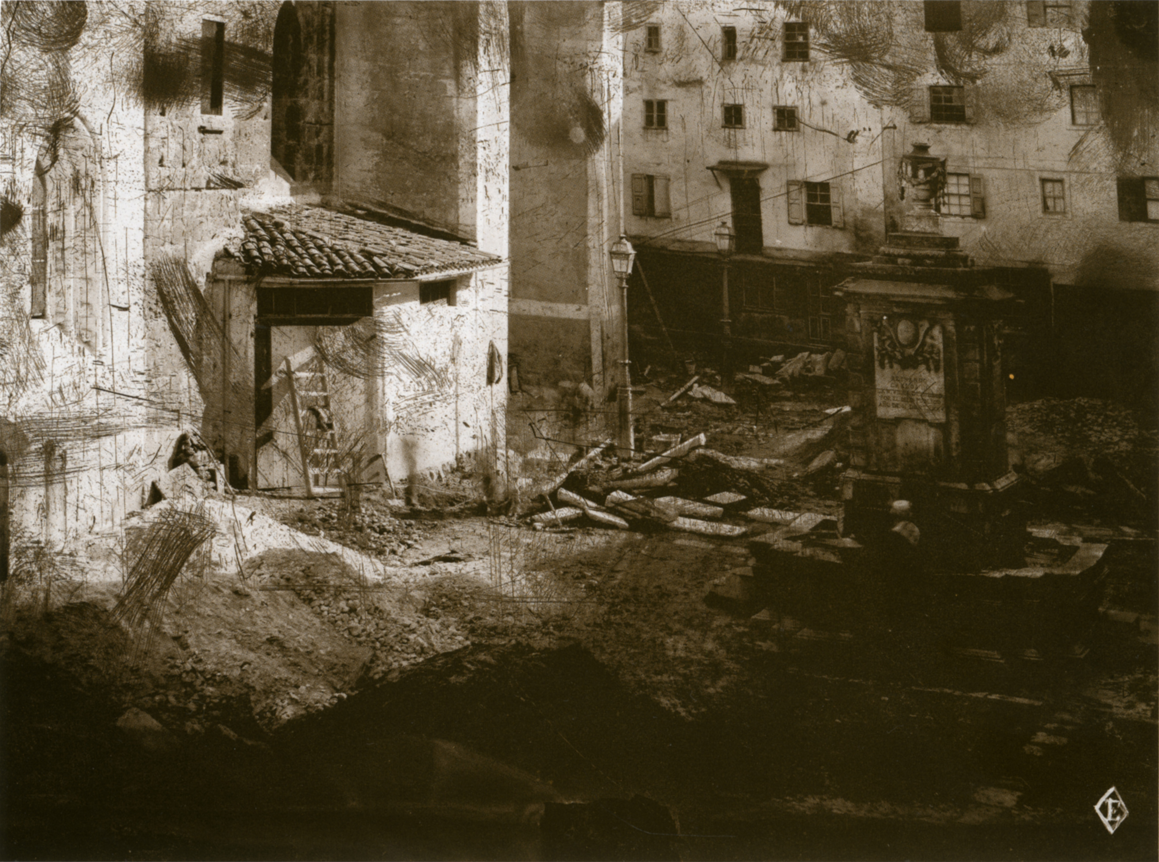 - ES Plazuela de Santiago hacia 1855. En medio de la plaza, la fuente de Paret construida en 1785.
