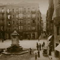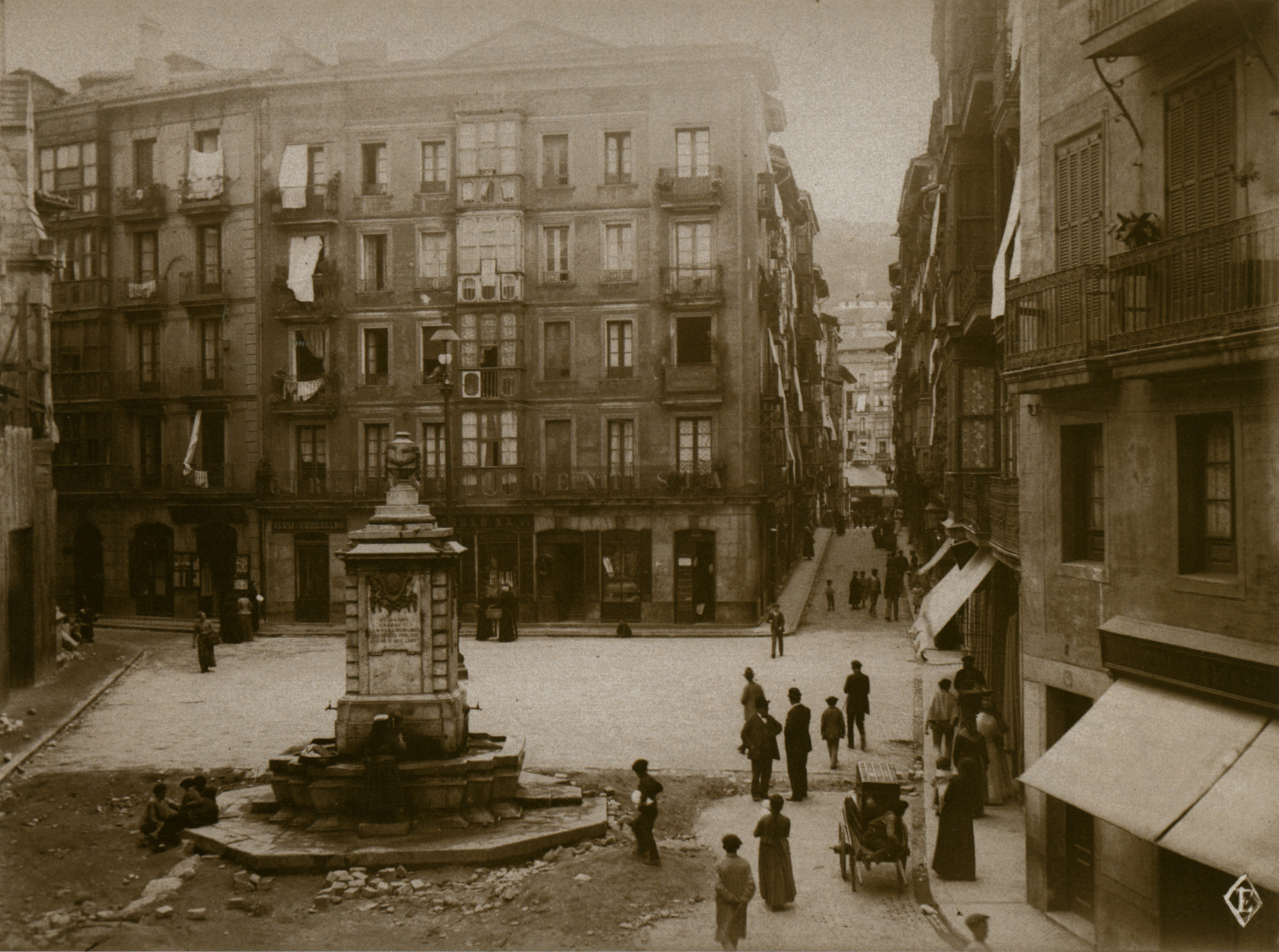 Plazuela de Santiago antes de 1890. Desde uno de los balcones de la casa Errazquin, la catedral mantiene la portada vieja. El toldo de la derecha es de la Farmacia Monasterio (1789-1982), regentada en esa época por la viuda de Eusebio Monasterio Ochoa, María Martínez y Rivas. Al fondo de Carnicería Vieja, los pabellones del mercado de Julio Saracibar y las casas del muelle Marzana.
