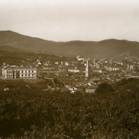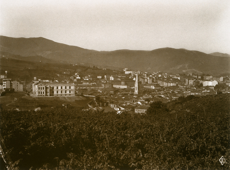 Bilbao desde Dolareche después de 1890. Foto tomada por encima de la calle Prim. Se ve la aguja nueva de Santiago, y las escuelas de Solocoeche en construcción. Este edificio, proyecto de Edesio de Garamendi en 1890, destinado a ser el pabellón de enfermedades venéreas del hospital de Achuri. Luego sede de la Escuela de Magisterio, y en la actualidad Karmelo Ikastola.