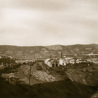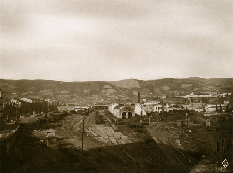 Estación del Norte hacia 1875, vista desde el puente de Cantalojas. Estación del FC Bilbao-Tudela, ubicada en terrenos del linaje de los Basurto, inaugurada en 1862. Planos del arquitecto Cipriano Segundo de Montesinos. El FC Bilbao-Tudela se inauguró en 1863