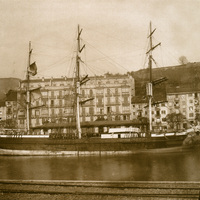 Bergantín Herschel en el muelle de la Sendeja (abril 1891). Tras la embarcación las casas de Manuel Taramona, obra del arquitecto Julián de Zubizarreta, construidas en 1888.