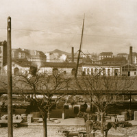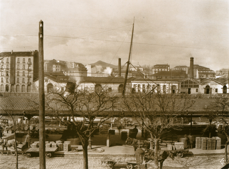 Tinglado de la Sendeja hacia 1890. En el muelle de Ripa, Fabrica de Serrería de Arana e Hijos (tras el poste eléctrico), sierra a vapor y gran depósito de maderas de Hilario Lund y Claussen. La chimenea del centro es del taller mecánico de Sorensen, Yakhelln y Cía en la calle de la Sierra (hoy Buenos Aires), embrión de la Compañía de Maderas. Al fondo, la cúpula de las escuelas de Berástegui, obra de Joaquín Rucoba, financiadas por la familia Zabálburu.