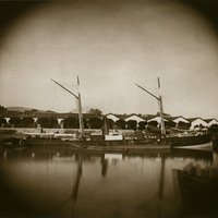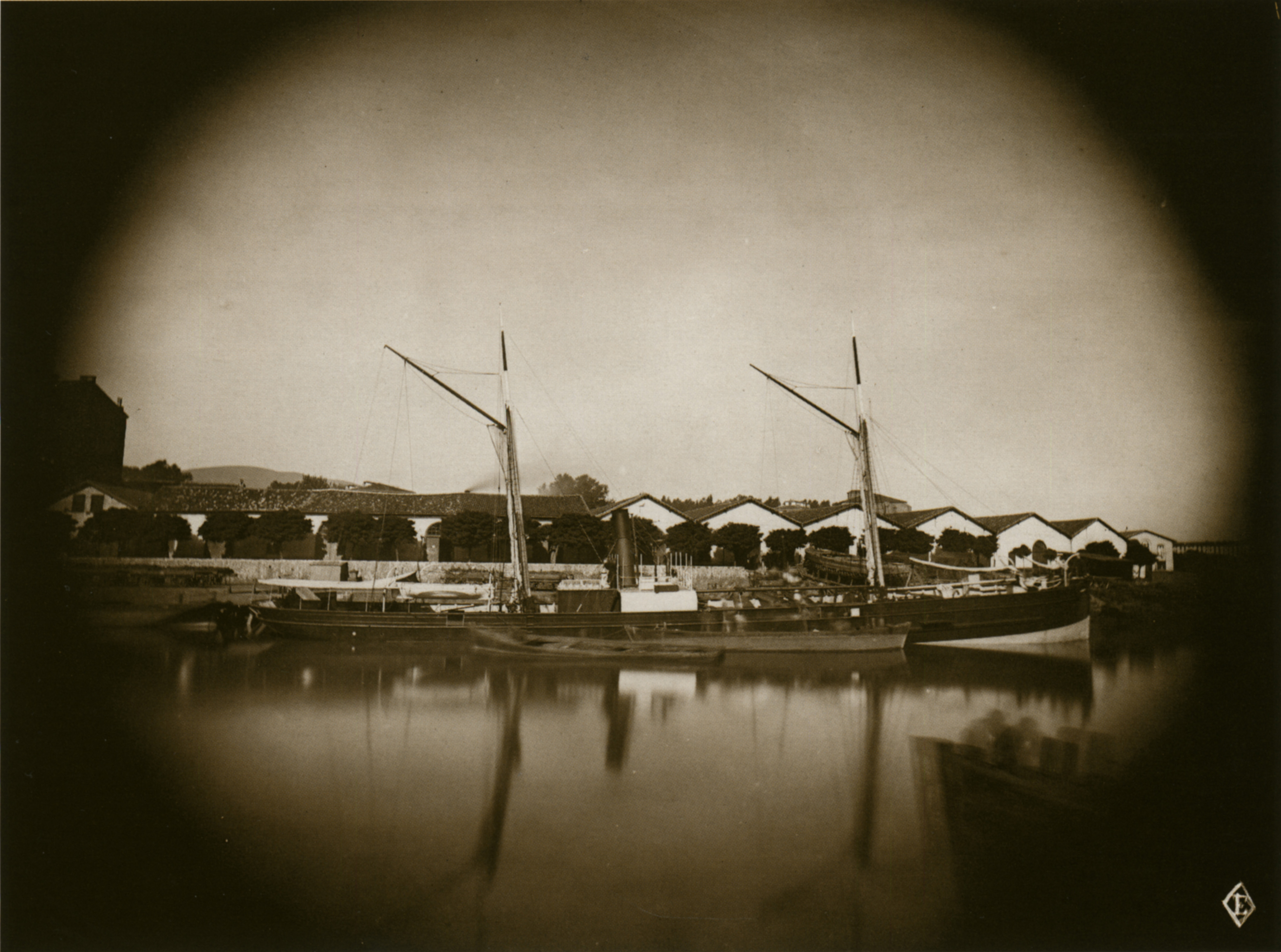 Final del muelle de Ripa y comienzo de Uribitarte, hacia 1870. Se ven las instalaciones portuarias conocidas como casa de la locomotora, obra del arquitecto municipal Francisco Orueta, al final de Ripa. Se ve el ramal de mercancias para el transporte de mineral de Ollargan, conectado con la Estación del Norte. A la derecha, en el astillero de ribera, un barco en construcción.