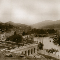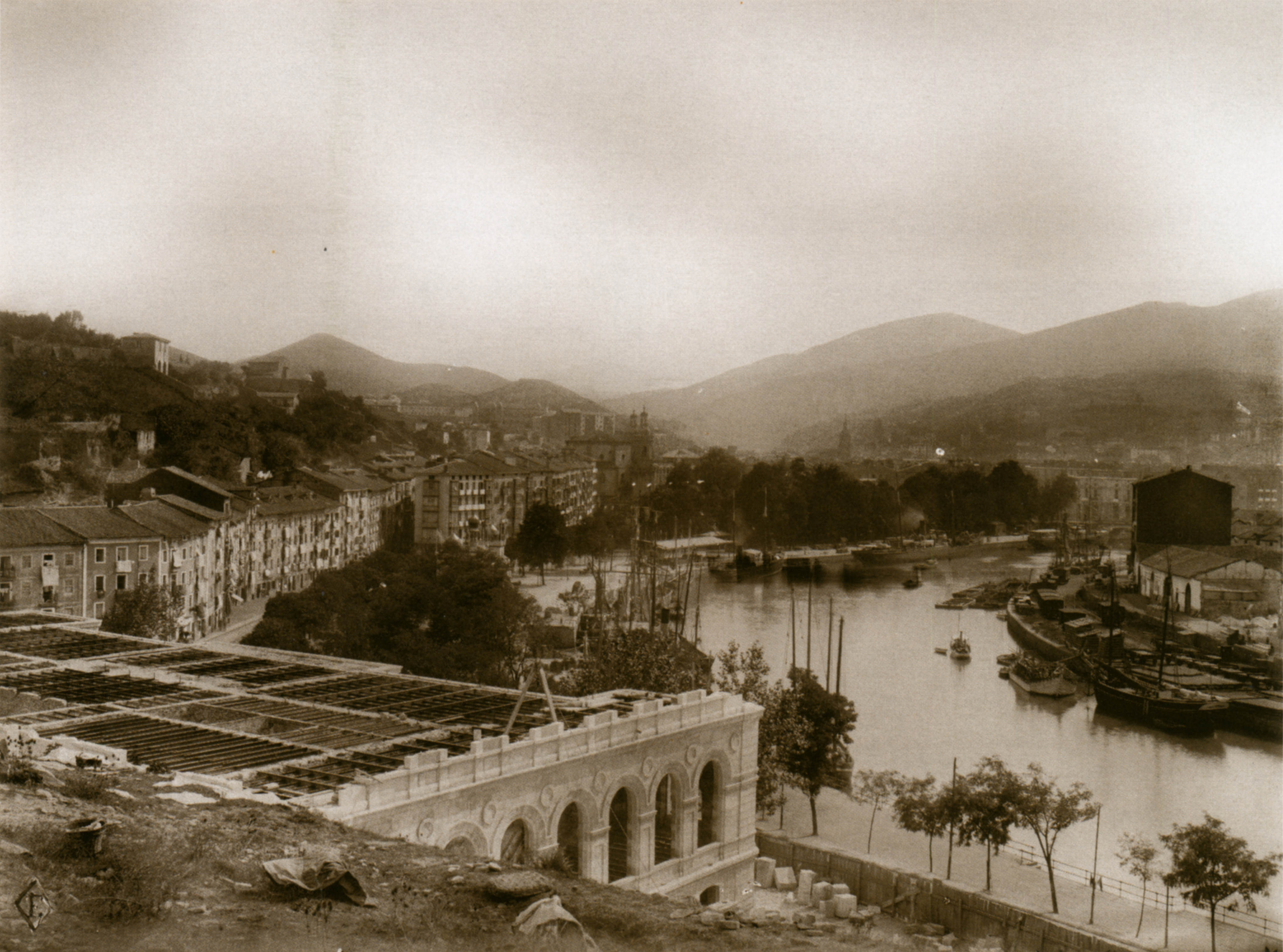 Ayuntamiento de Bilbao en construcción, hacia 1889. Con los balcones engalanados por fiestas, se ve el forjado del edificio, obra de Joaquín Rucoba. Las obras empezaron en 1883, y se inauguró en 1992. Ya está canalizada la ría con los muelles de Ripa.