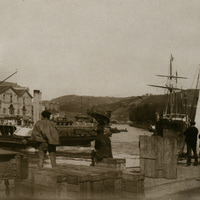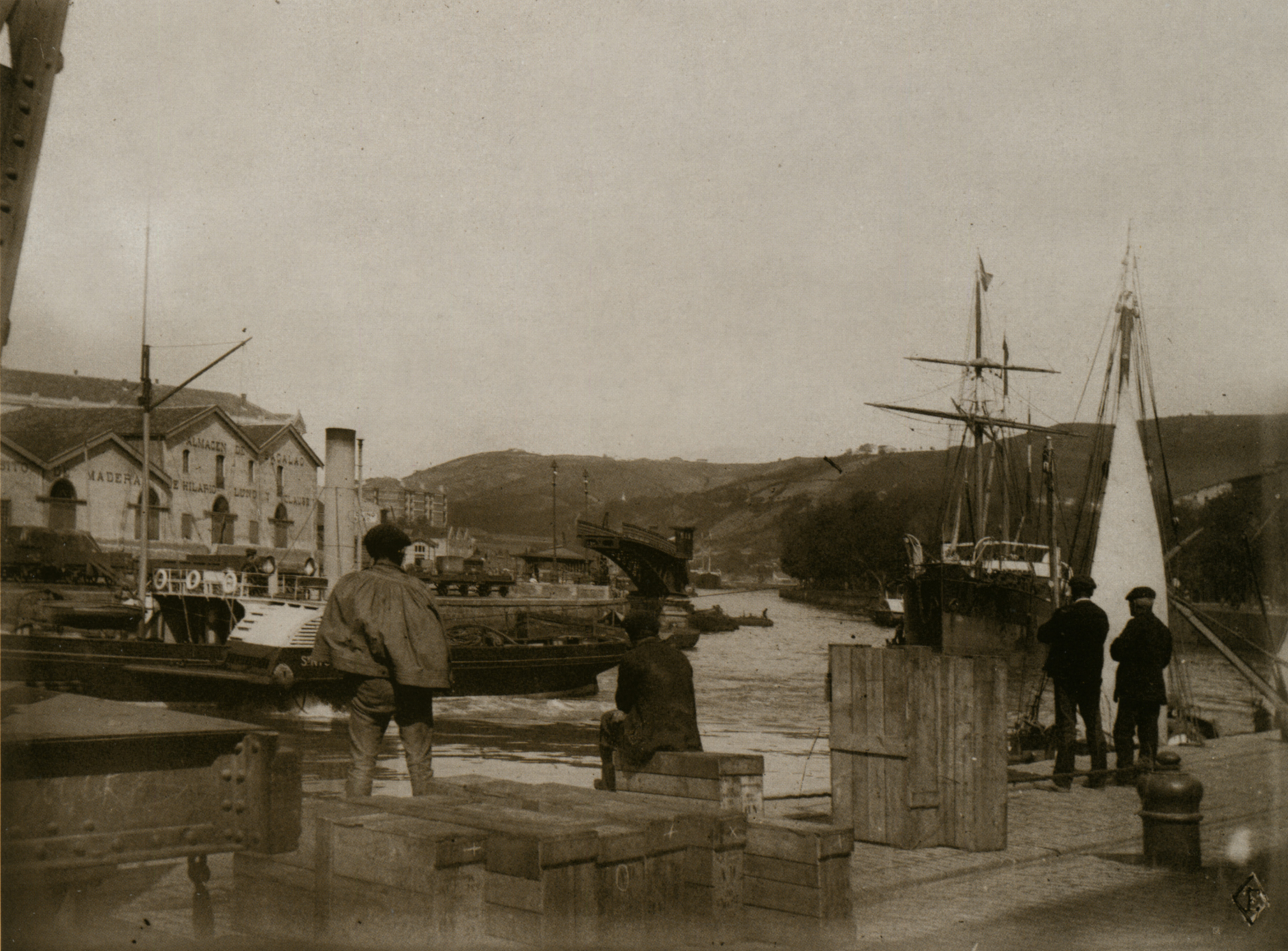 Muelle de La Sendeja y puente del perro chico hacia 1893. Puente giratorio obra del ingeniero Brahon, construido en los talleres de Zorroza (José de Orueta), e inaugurado en 1892. Unía la calle de la Sierra (hoy Buenos Aires) con el ayuntamiento.
