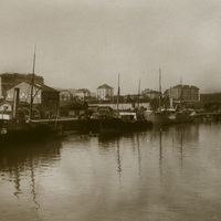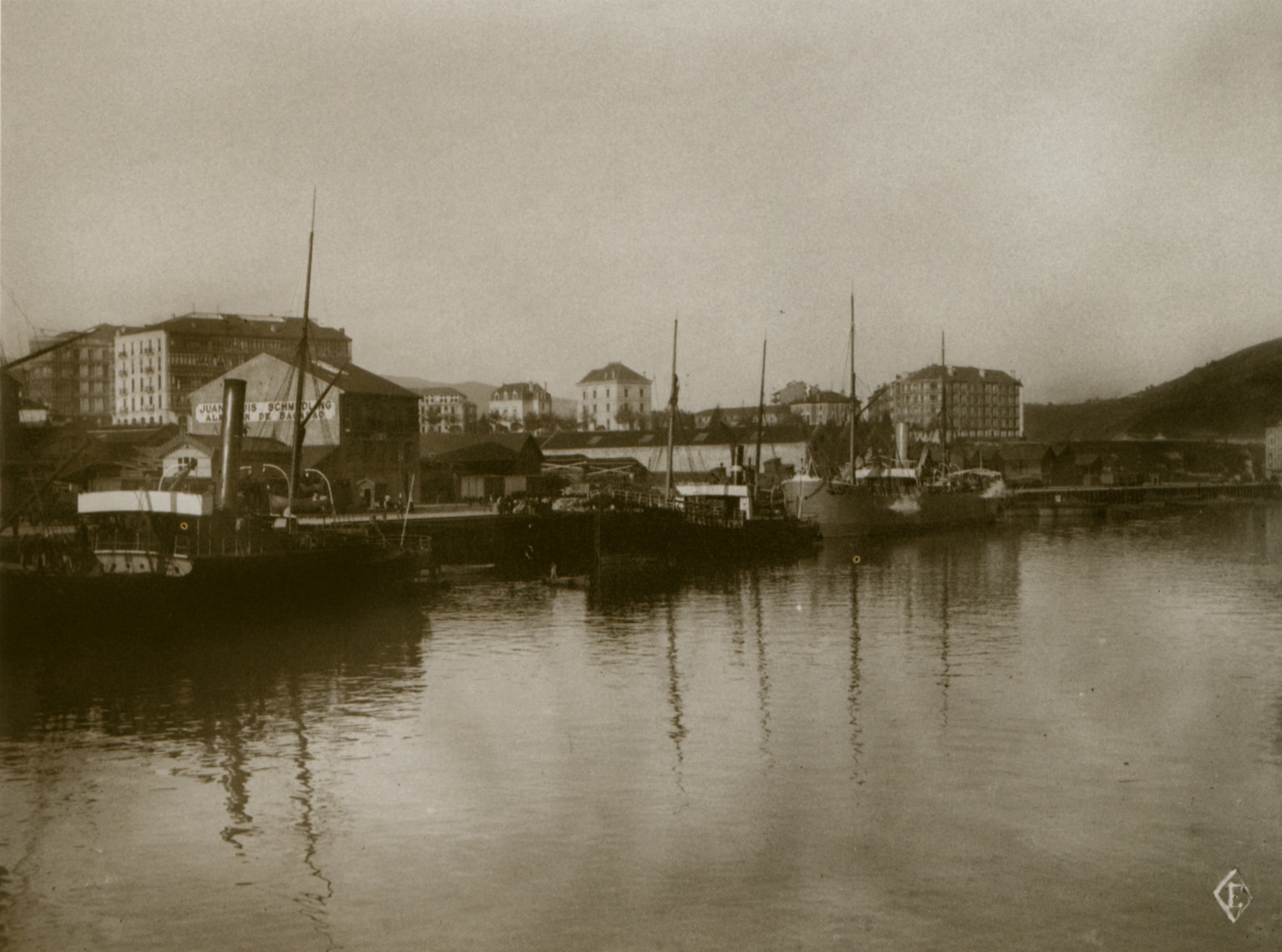 Muelle de Uribitarte hacia 1890. Con la ría ya canalizada, se ve el almacén de bacalao de Juan Luis Schedling, levantado en 1883. En el centro el chalet La Perla, de Hilario Lund, propietario de los almacenes y sierra a vapor del muelle de Ripa.