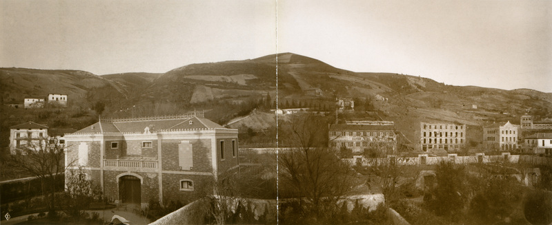 Trasera del Campo Volantín hacia 1890. De izquierda a derecha: 1.- Cocheras del chalet nº 38, conocido como casa de los leones, de la familia de Romualdo García. 2.- Taller mecánico Carpintería Guridi- 3.- Matadero municipal en Tívoli, inaugurado en 1882