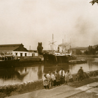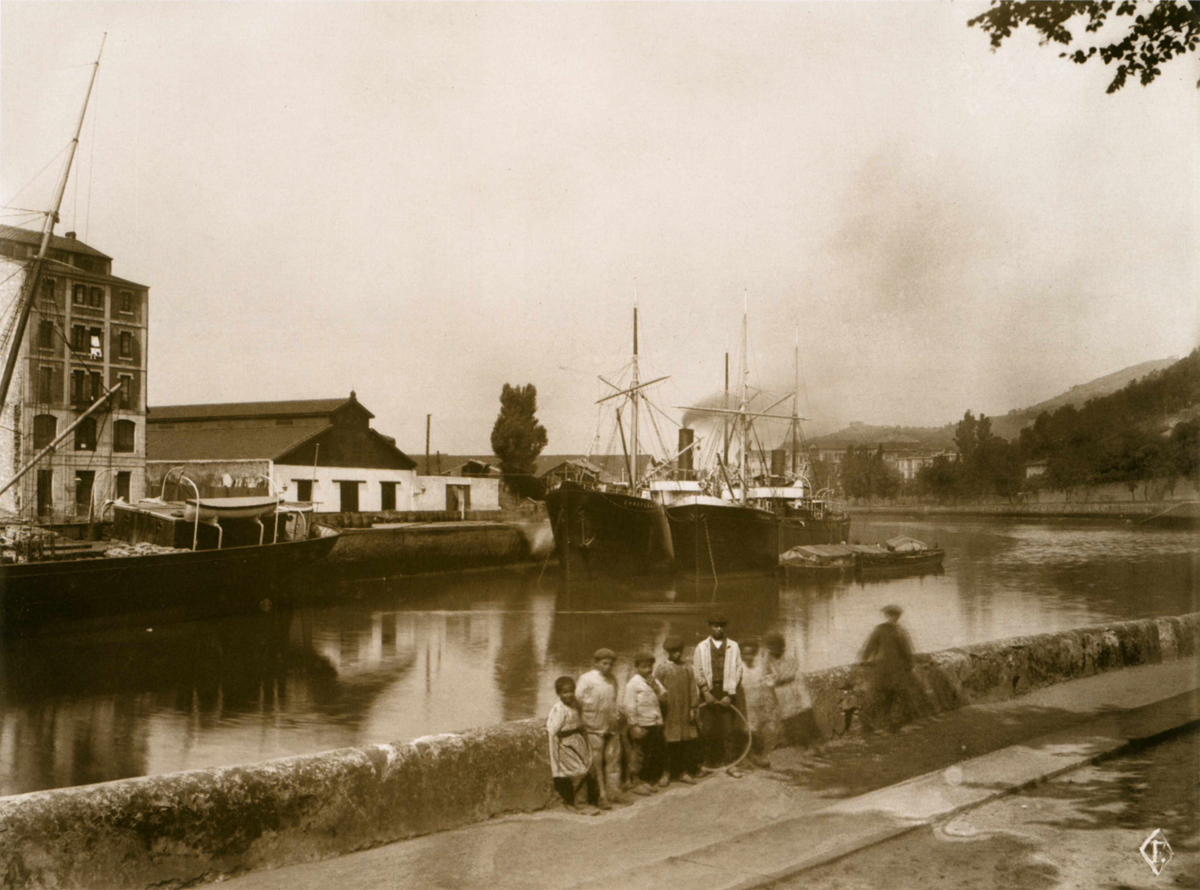 Muelle de Uribitarte hacia 1888, visto desde el Campo Volantín. Niños jugando con un aro. Muelle de la Naviera Vasco-Andaluza, absorbida en 1888 por la naviera Ybarra y Cía. Amarrados, los vapores Cabo Peñas e Itálica
