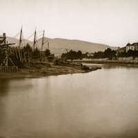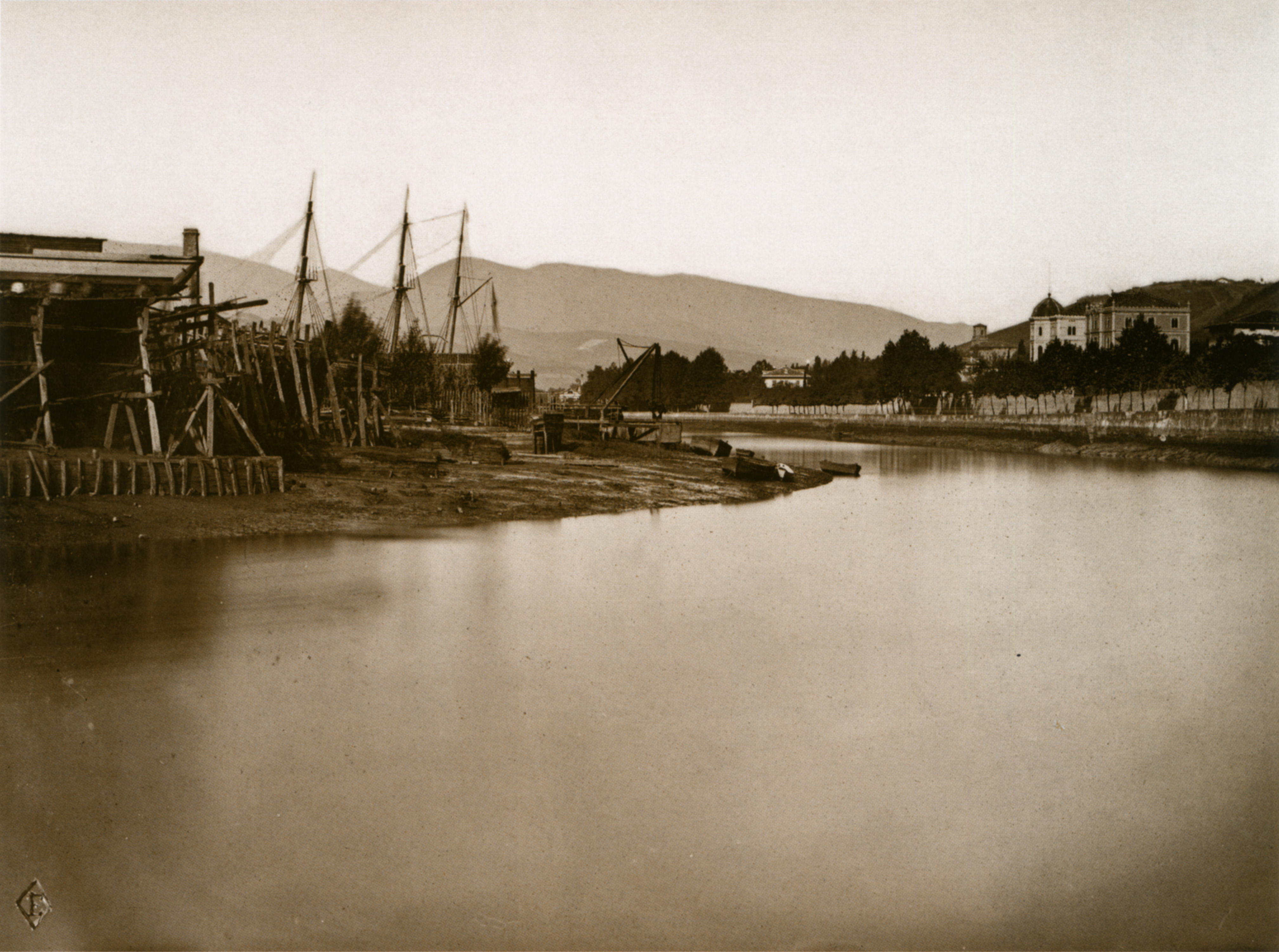 Astillero de la Salve (o de la Vega) hacia 1880. En la margen derecha, las Casas de La Cava, construidas por los Ybarra en 1869. Al fondo la torre de la Iglesia de San Pedro de Deusto.