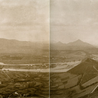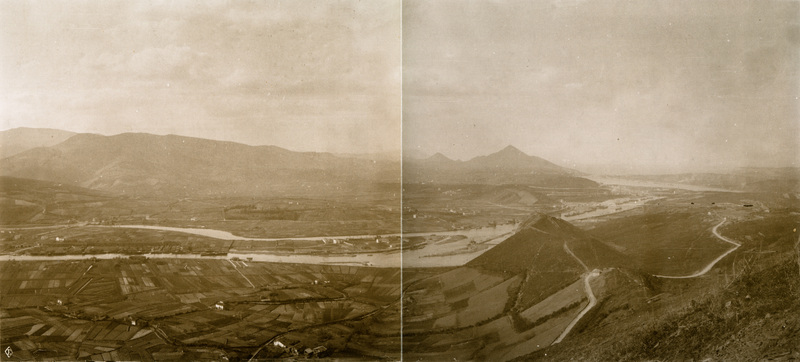 Panorámica de la ría desde Deusto hasta el Abra hacia 1880. Monte Banderas en primer término a la derecha. Enfrente, en Zorroza, el arsenal, el puente de Burceña sobre el Cadagua. A la altura de Cruces la finca Munoa. Bajo el monte Cabras la ría está siendo encauzada entre Elorrieta y la desembocadura del Cadagua. Al fondo el Serantes.