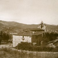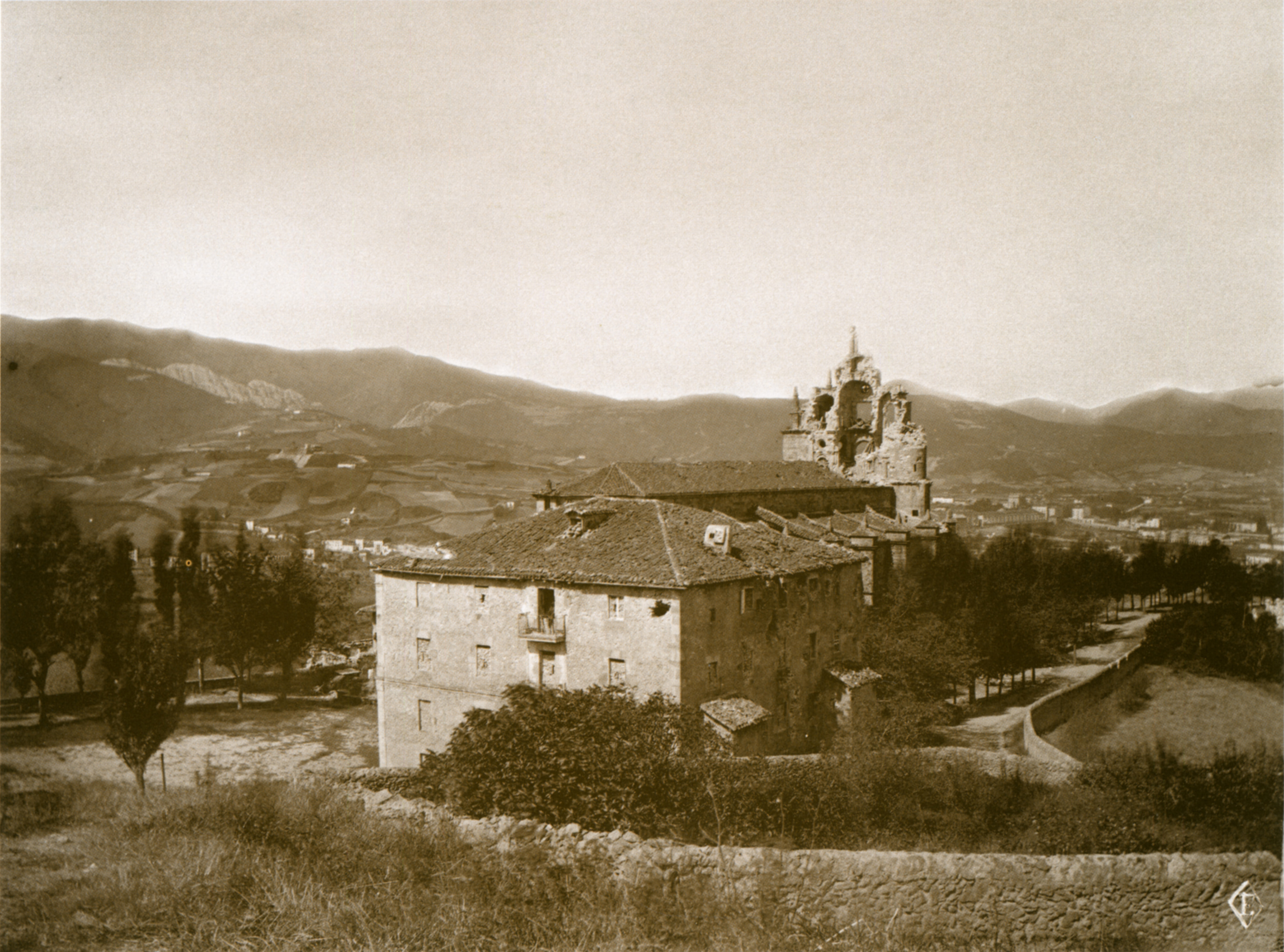 Trasera de la basílica de Begoña, y de la Casa de la República de Begoña. Vista desde el alto de Artagan. Este edificio era obra del arquitecto Julián Pastor, inaugurado en 1856, y demolido en 1957-58 para construir los túneles de la N-634.