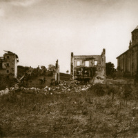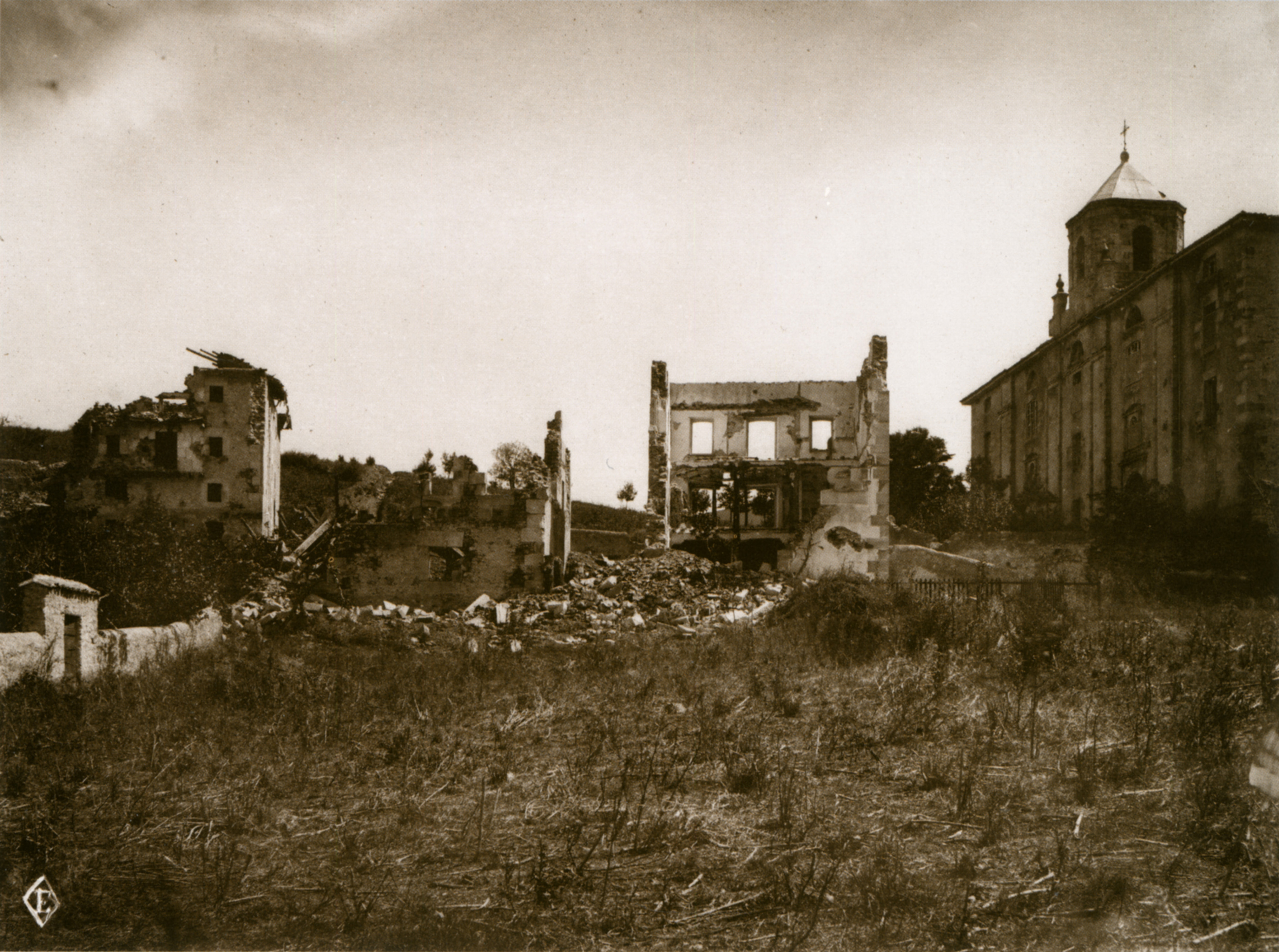 Casas bombardeadas junto al Monasterio de Santa Mónica, en la calle Zabalbide, hacia 1875. El monasterio de Santa Mónica, de religiosas de la orden de San Agustín, está desde 1860 en el nº 61 de la calle Zabalbide.