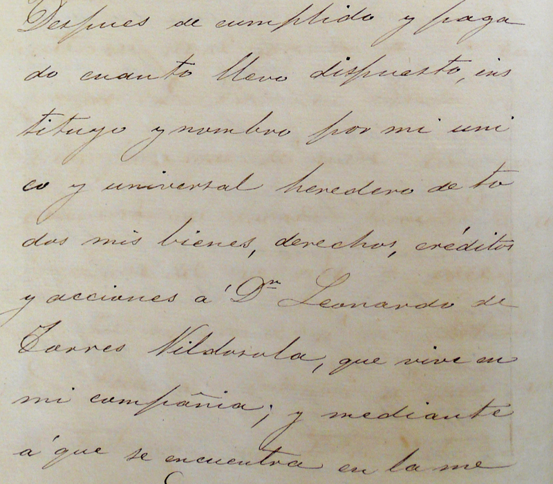 - ES Leonardo Torres Vildosola, mi único y universal heredero de todos mis bienes. Año 1864.