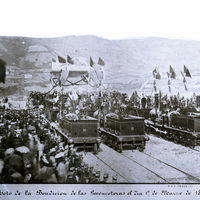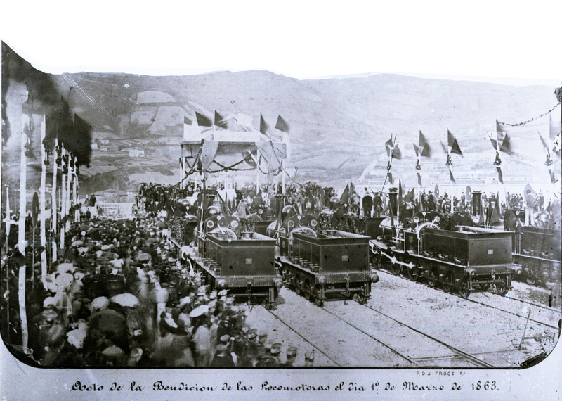- ES Acto de la Bendición de las locomotoras el día 1 de Marzo de 1863. Al fondo se ve el Palacio Quintana.