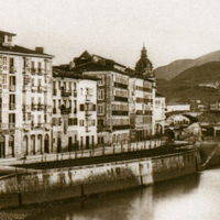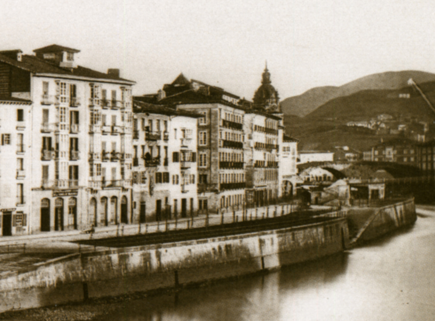 Calle de La Ribera hacia 1874, donde se encontraban los principales almacenes comerciales y escritorios de la villa: Schmidt, Ybarra, Urigüen, Lascurain, Chalbaud. Eran unos 20 inmuebles, y la numeración comenzaba a partir de la plaza vieja (Ybarra número 8, Errazquin número 12). Falta el primitivo puente de madera de La Merced, obra de Francisco de Orueta inaugurado en 1875.