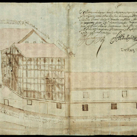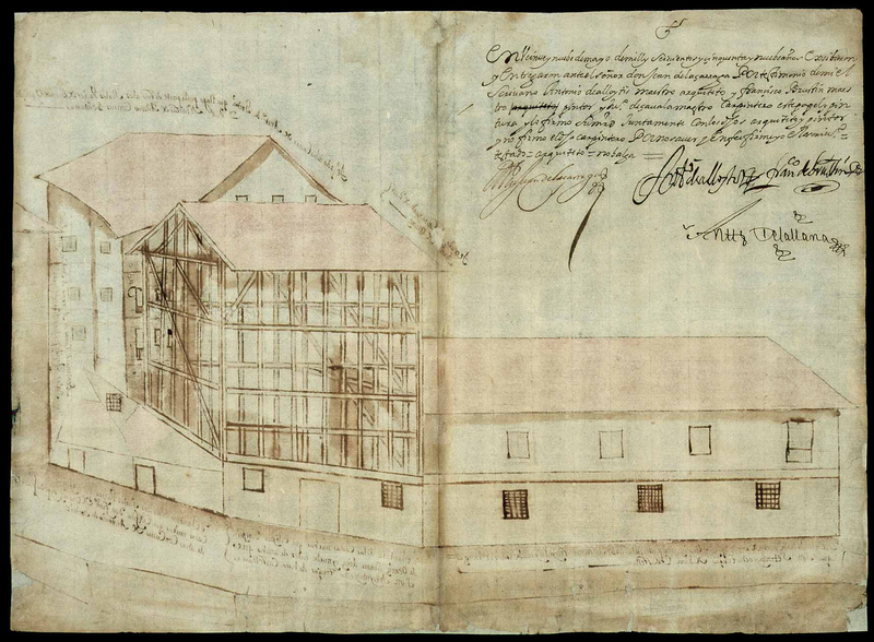 - ES Contiene Leyenda: ladera de las casas de Juan Perez de Ocariz a la parte de la rebera, tienen treynta y nuebe codos de largo (...) Delantera de las casas nuebas que edifica don Francisco de Ocariz (...)