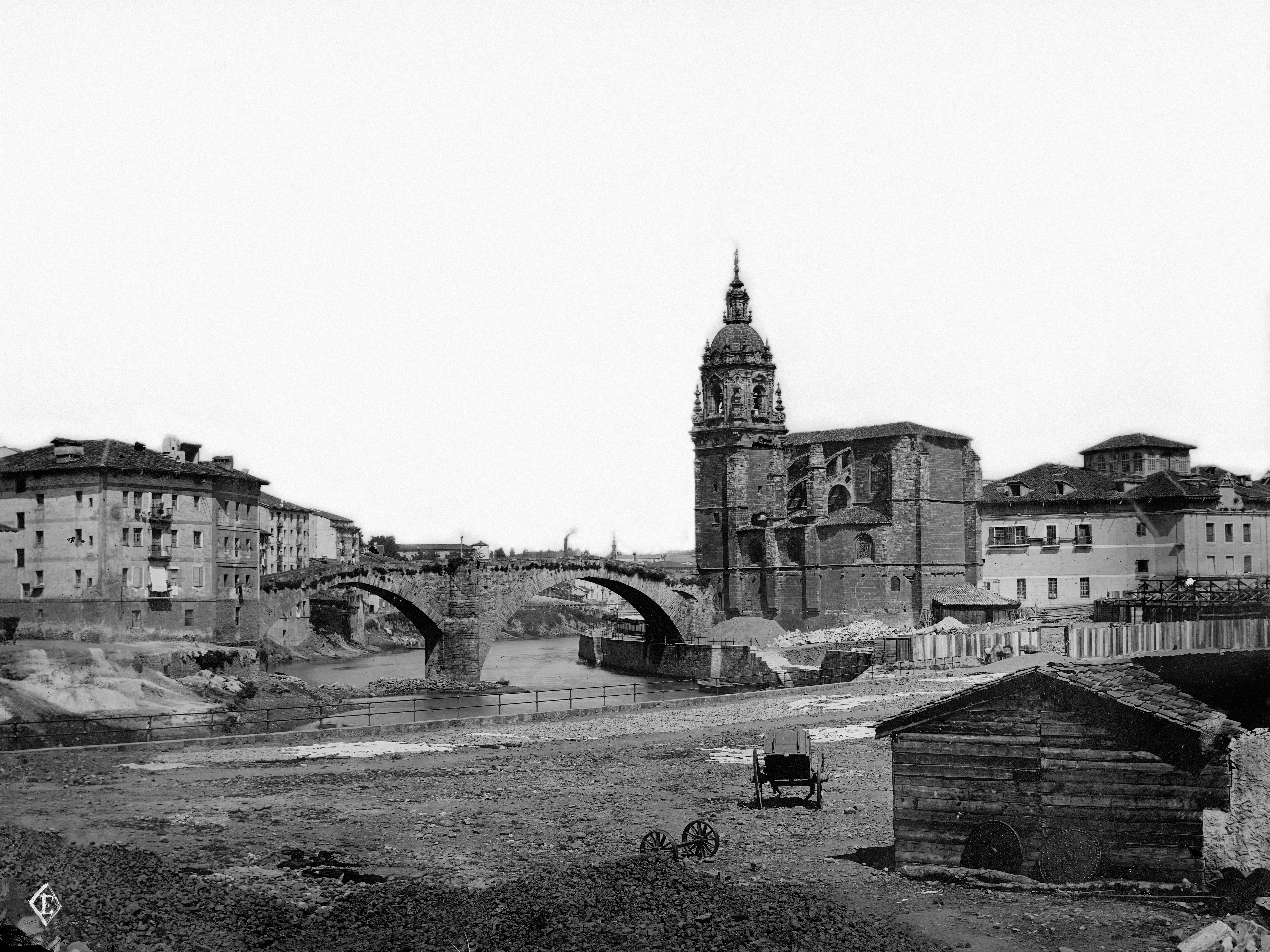 Vista general desde Atxuri. Cerca de 1874. A la derecha, fachada posterior del antiguo ayuntamiento, obra del maestro Santiago de Castaños, inaugurado en 1683. El puente está en servicio pero en el muelle de Ibeni se aprecian las obras para el nuevo, que se inaugurará en 1877. A la izquierda, junto al puente, Casa de la Rentería.