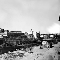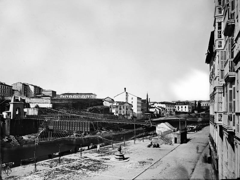 1874. Exterior. Vista de la plaza vieja, con fuente pública y ropa colgada. Este puente colgante, proyecto de Felix de Uhagon y dirección de Antonio de Goicoechea, fue inaugurado en 1855 y quedó destruido por los bombardeos que sufrió la villa durante la II Guerra Carlista. A la izquierda de la iglesia y convento de la Merced, se localiza la fábrica de harinas de Juan Zabala y Fermin Arnedo, con la chimenea indicativa de su funcionamiento a vapor, luego pasó a Toribio Ugalde y Fábrica de conservas alimenticias La Constancia . A la derecha, despues de las casas que hoy son convento, Casa de La Naja, en terrenos de Abando, donde según Labayru se redactó el Fuero Nuevo en 20 días, en 1526 esta era la casa de Martin Saenz de la Naja y los escudos que tenía se conservan en una finca de los Arrieta Mascarua en Encartaciones. - Muy semejante, ver ERR-030