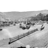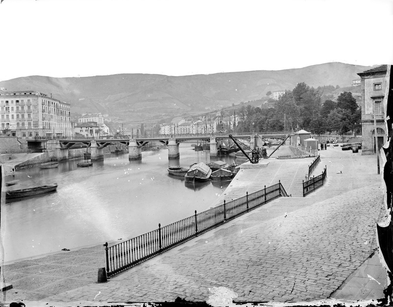 Antes de 1874. Vista desde el muelle de La Ribera donde se aprecia la rampa a la ría, grua de puerto y casetas de aduana. El puente de Isabel II con el teatro viejo a la derecha y la casa Mazas a la izquierda. Tras éste los árboles de El Arenal y al fondo casas de La Sendeja, Mallona y las falda de Artxanda