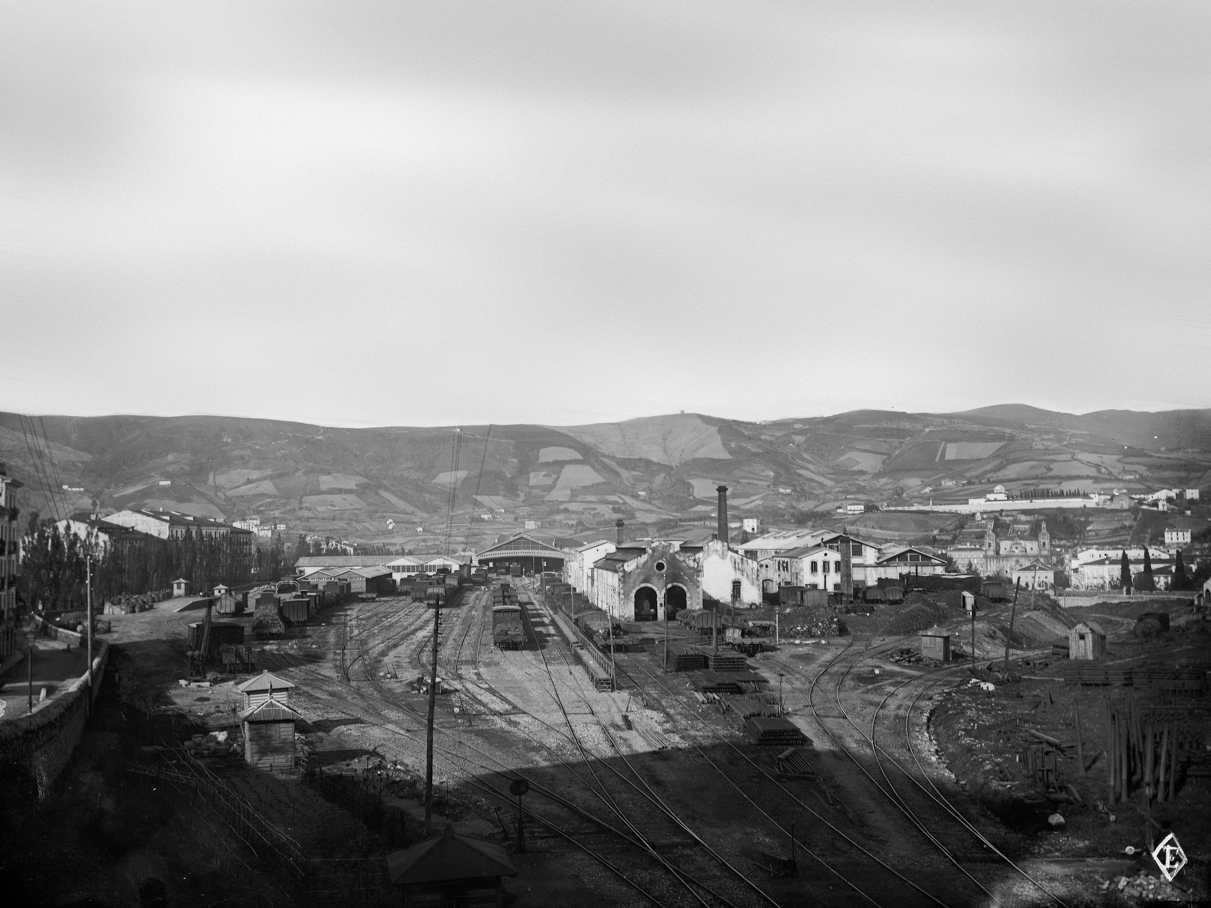 1875. Exterior. Vista general de la primitiva estación de ferrocarril, desde el actual puente de Cantalojas. Los terrenos en que se levantó eran del linaje de los Basurto y en la obra intervino el arquitecto Cipriano Segundo de Montesinos. Fue inaugurada la línea hasta Miranda de Ebro en Abril de 1863 y hasta Tudela en Agosto del mismo año. A la izquierda, se aprecia la actual calle Hurtado de Amezaga, entonces calle de la Estación, y a la derecha, el teatro y la igelsia de San Nicolás.