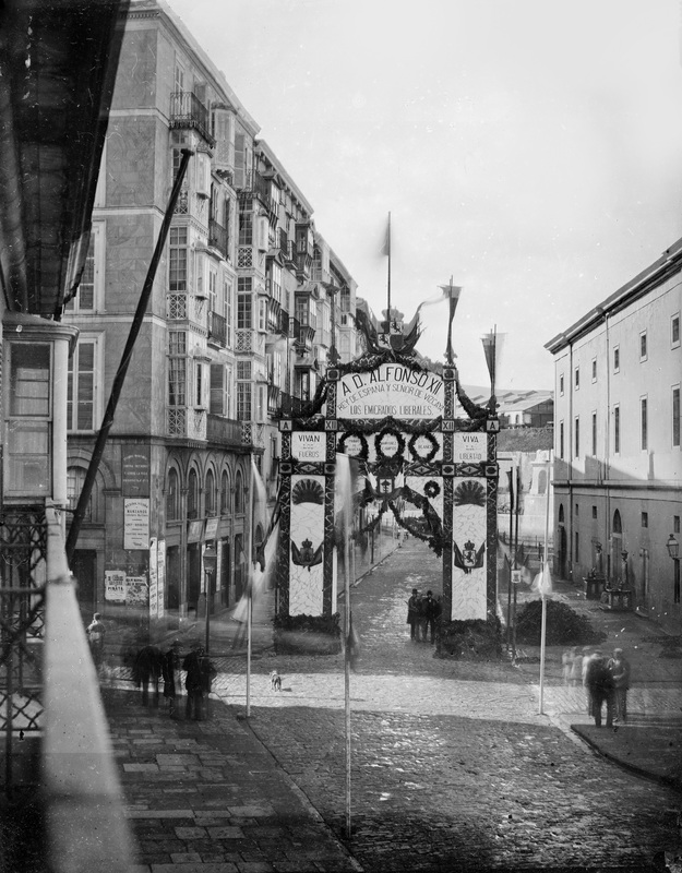 Marzo 1876. Vista general, desde el Arenal hacia la Ribera, del arco de triunfo colocado en la calle la Ribera, al costado del teatro, con dedicatoria en la parte superior "A D. ALFONSO XII / REY DE ESPAÑA Y SEÑOR DE VIZCAYA / LOS EMIGRADOS LIBERALES", y una serie de frases alusivas a los fueros, liberales y libartad.