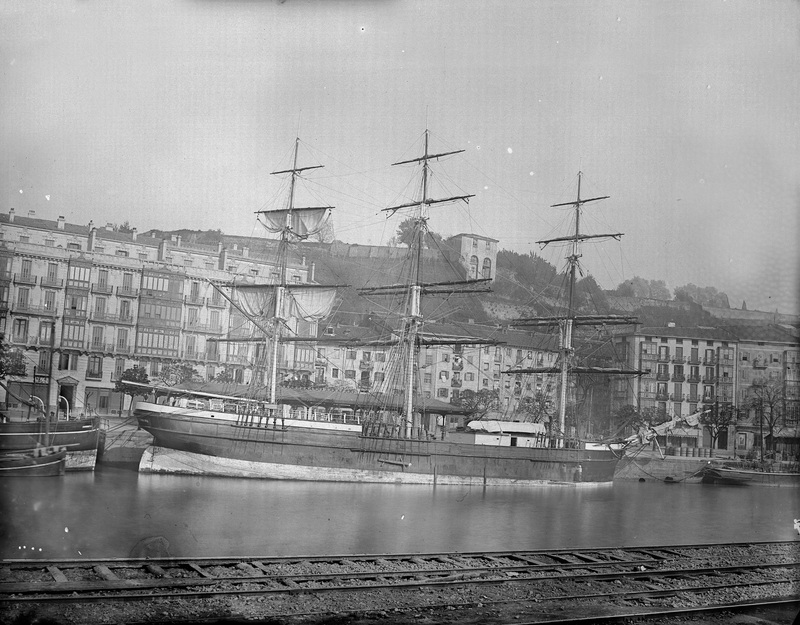 Abril 1891. Vista tomada desde el muelle de Ripa, con los railes del tren a Portugalete en primer término, hacia la Sendeja en cuyo muelle está atracado el bergantín "HERSCHEL" y el vapor "SOMORROSTRO". Tras la nave, el final de la calle Estufa, actual Vda. de Epalza, en cuyo nº 14 se situa el Café de la Marina, luego Café del Puerto, y parte de las casas de Sendeja donde destaca, a la izquierda, las casas de Taramona, obra del arquitecto Julian Zubizarreta, construidas en 1888.