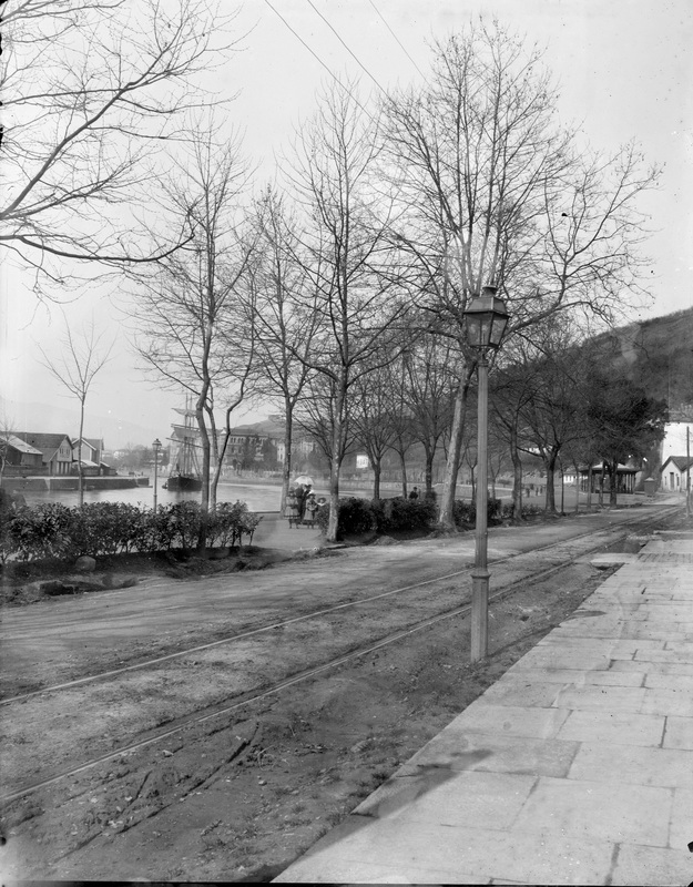 1890. Vista hacia Deusto de este clásico paseo de la villa. Destaca la presencia de las vías para el tranvía urbano de caballos. Al fondo a la deracha, el tinglado portuario de Churruca, en La Salve donde se localizaba la "Cadena" y Fielato, , era el límite jurisdiccional desde 1870 entre la villa y la anteiglesia de Deusto. Al fondo las casas de la Cava y la universidad de Deusto.