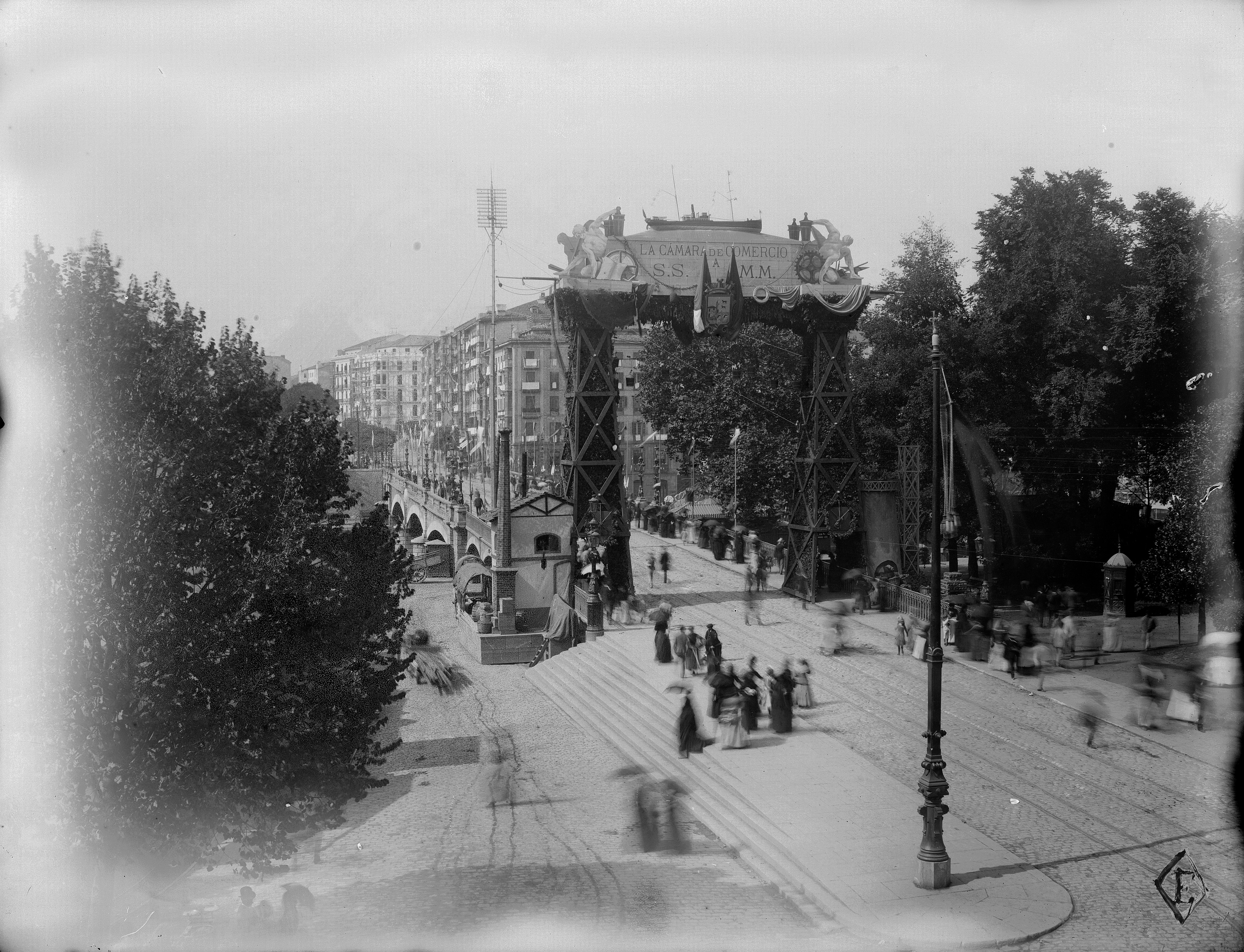 Septiembre 1887. Vista desde un inmueble de la calle El Arenal hacia la calle Navarra donde en la entreda al puente del Arenal aparece un arco de triunfo con leyenda "LA CAMARA DE COMERCIO A SS MM", levantado con motivo de la visita de la reina regente Maria Cristina y su hijo Alfonso XII, de 15 meses.