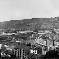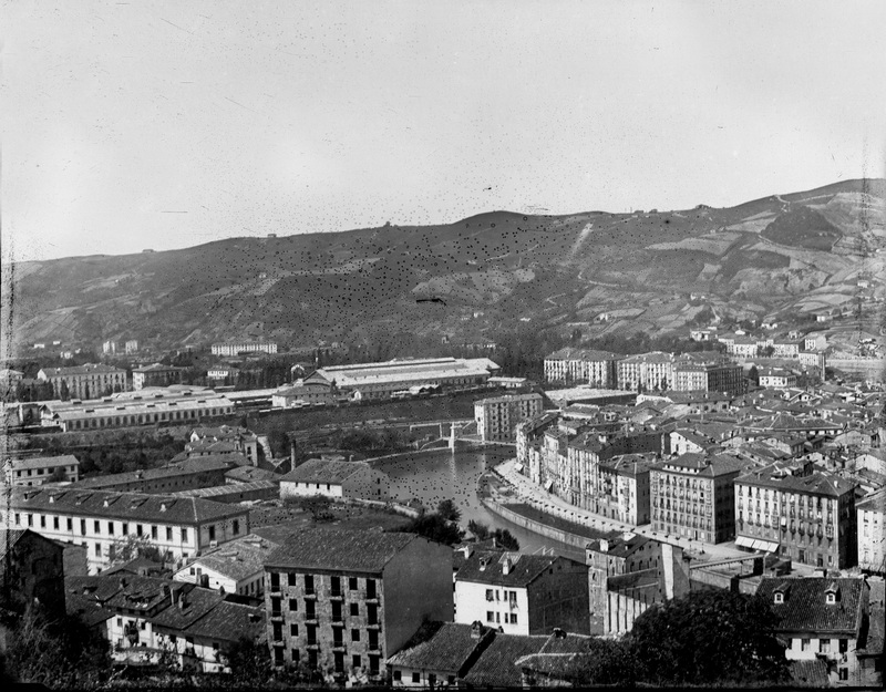 Antes de 1874. Vista desde algun punto de Miribilla donde aparece en primer término parte del barrio de San Francisco, frontón a la derecha y cuartel a la izquierda, la margen derecha de la ría con los puentes de San Francisco y Los Fueros y la calle La Ribera. Cerrando el espacio urbano las instalaciones de la Estación del Norte y al fondo las faldas de Artxanda.