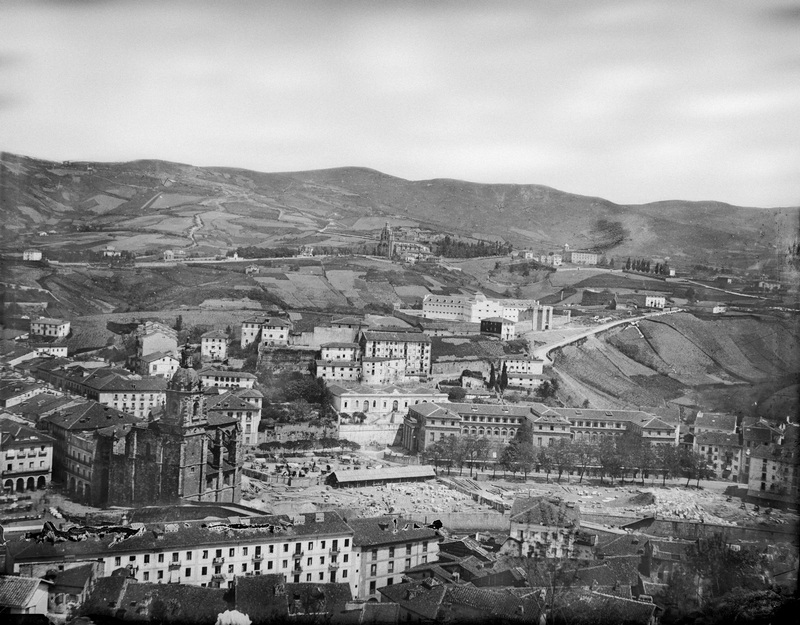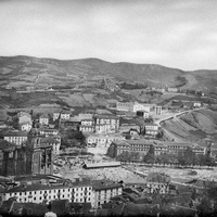 Antes de 1874. Vista tomada desde algun punto de Miribilla hacia Begoña. Aparece en primer término parte del barrio de San Francisco.Asomando algo el puente viejo, y las piedras que se van preparando para el puente nuevo. En la margen derecha de la ría, la iglesia de San Antón con el ayuntamiento adosado, el muelle de Ibeni con los materiales para el puente nuevo, y tras éste el hospital civil. Mas arriba, reconocemos el frontón de Zumarraga, la cárcel de Larrinaga y entre estos y el santuario de Begoña los prados y huertas de aquella anteiglesia.