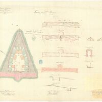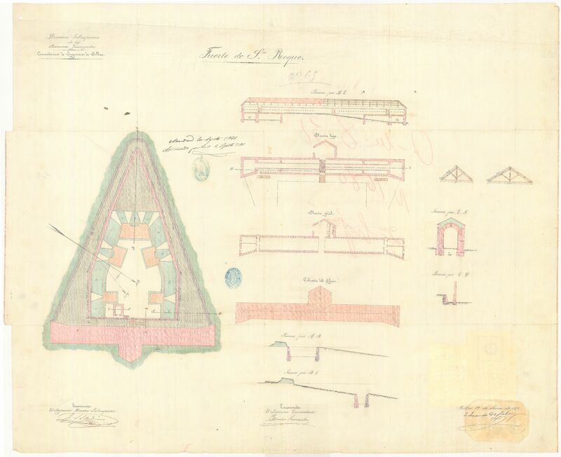 Orientado con flecha, N. al SE. y N magnético. Firmado rubricado y fechado en Bilbao. 'Examinado El Ingeniero Director Subinspector J.S. Sandino Examinado El Ingeniero Comandante Saturnino Fernandez'. Figura en su margen superior izquierdo: 'Madrid 10 agosto 1876 Aprovado por R.O. 4 Agosto 1876'.