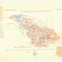 Relieve por curvas de configuración. Manuscrito firmado, rubricado y fechado en Bilbao en 1875. Manuscrito a plumilla en tinta negra, azul, siena, amarilla y carmín, iluminado a la acuarela en azul. Tabla de signos convencionales para indicar las posiciones carlistas. Sello del Depósito General Topográfico de Ingenieros. Arbolancha.