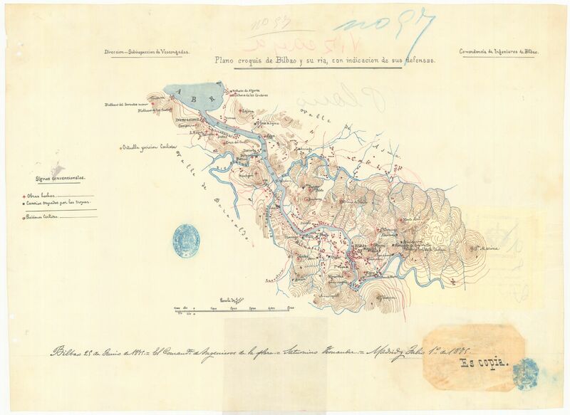 Relieve por curvas de configuración. Manuscrito fechado en Madrid. Es copia del manuscrito original del Comandante de Ingenieros de la plaza Saturnino Fernández, fechado en Bilbao 25 de Junio de 1875. Figura tabla de signos convencionales para indicar las posiciones carlistas.