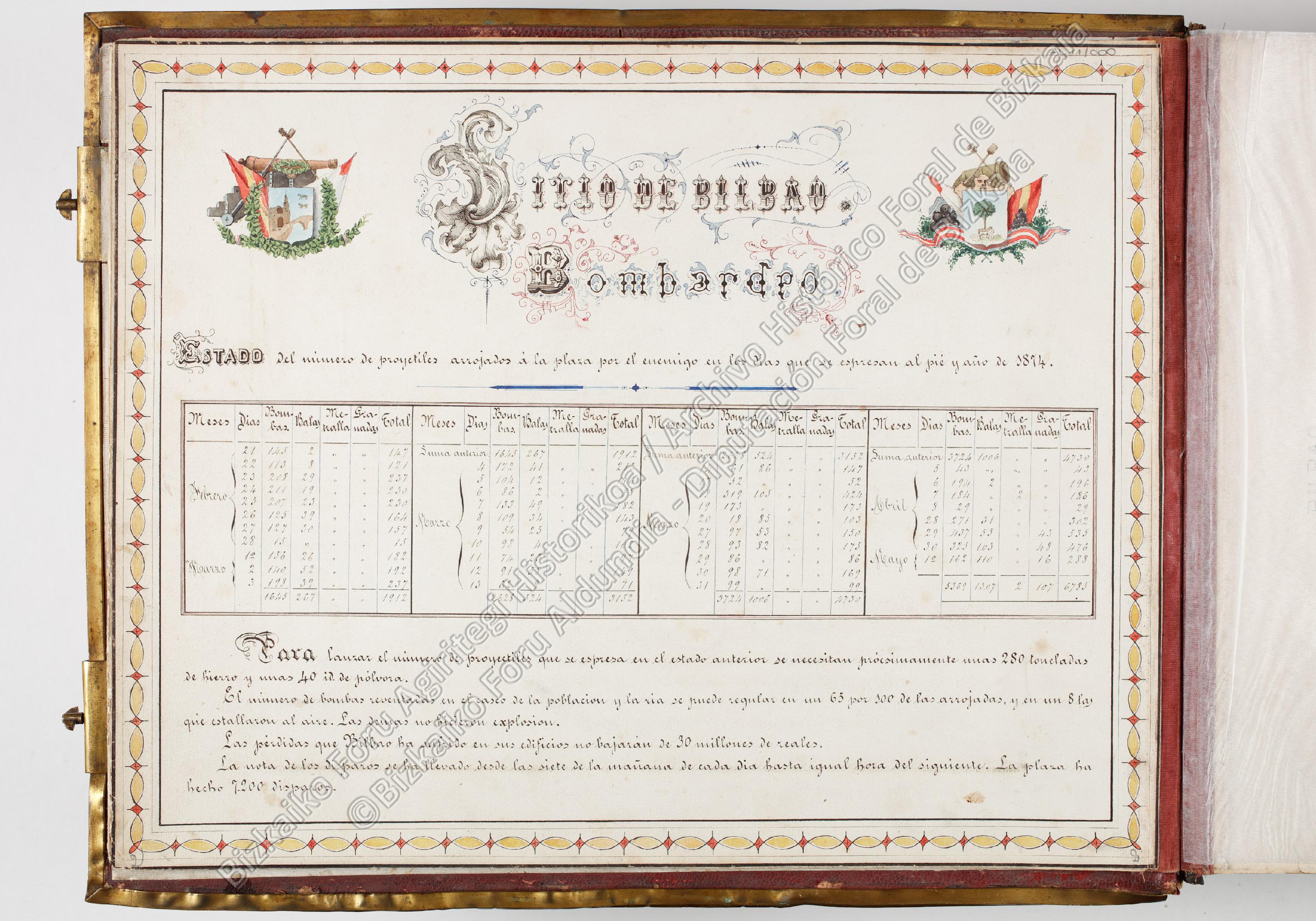 Álbum El Sitio de Bilbao de 1874, atribuido a Carlos Monney Millet. Piel granate con gofrados y dorado, con cierres, clavos e iniciales FA en metal.. Consta de noventa y cuatro fotografías. En el verso de la fotografía número uno existe una hoja manuscrita y coloreada a mano en la que se describe el estado del número de proyectiles arrojados a la plaza por el enemigo en los días que se expresan del año 1874.